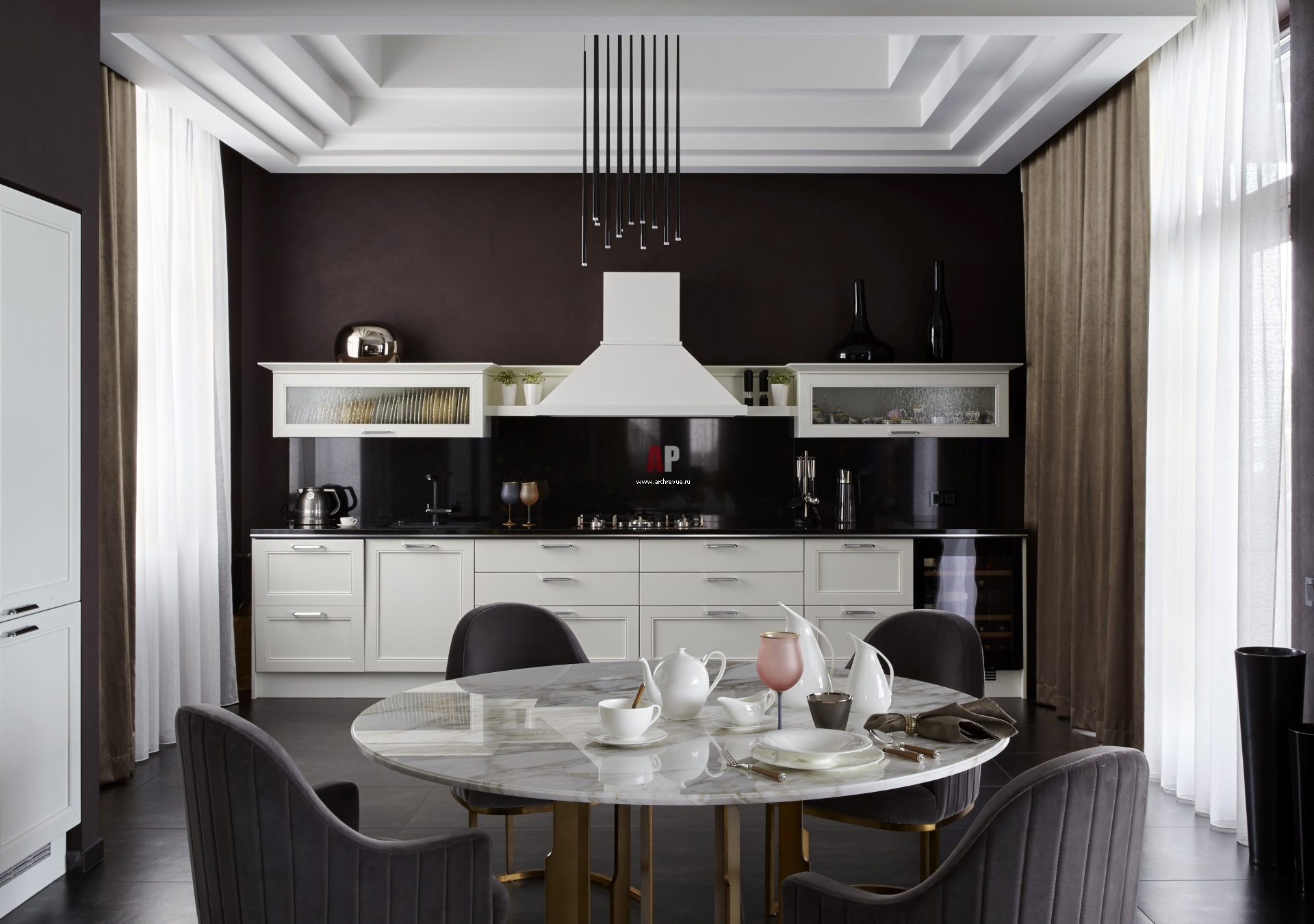 Кухня является продолжением гостиной. Декор белых фасадов кухонного гарнитура Scavolini рифмуется с рисунком потолочной лепнины.