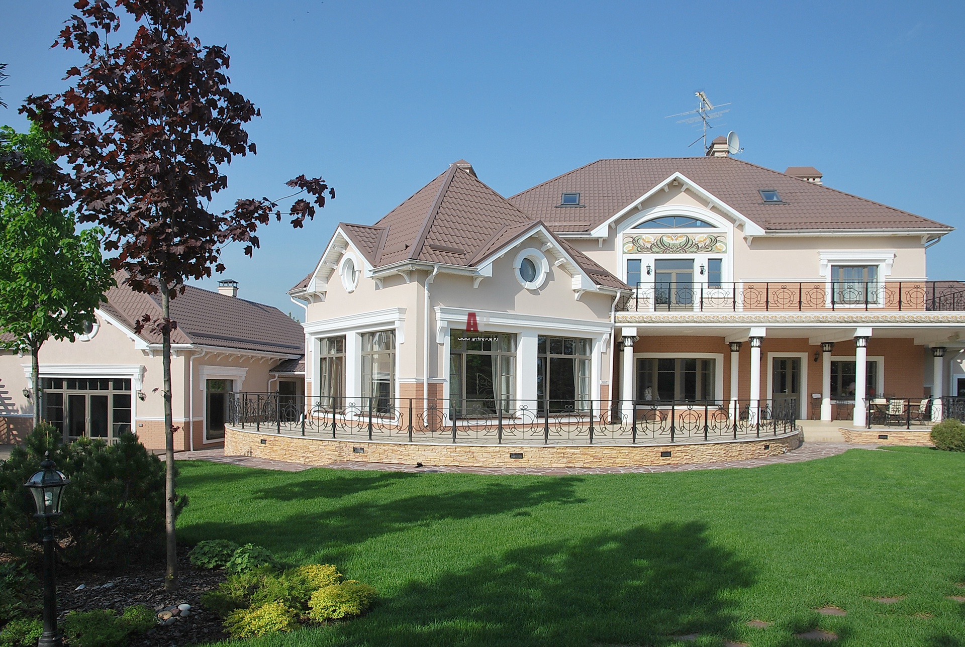 На фото – фасад двухэтажного дома в стиле современная классика и бежево-золотистой цветовой гамме. Одноэтажный объем украшен характерным французским круглым окном. Фриз над балконом декорирован росписью с мотивом «одуванчики».