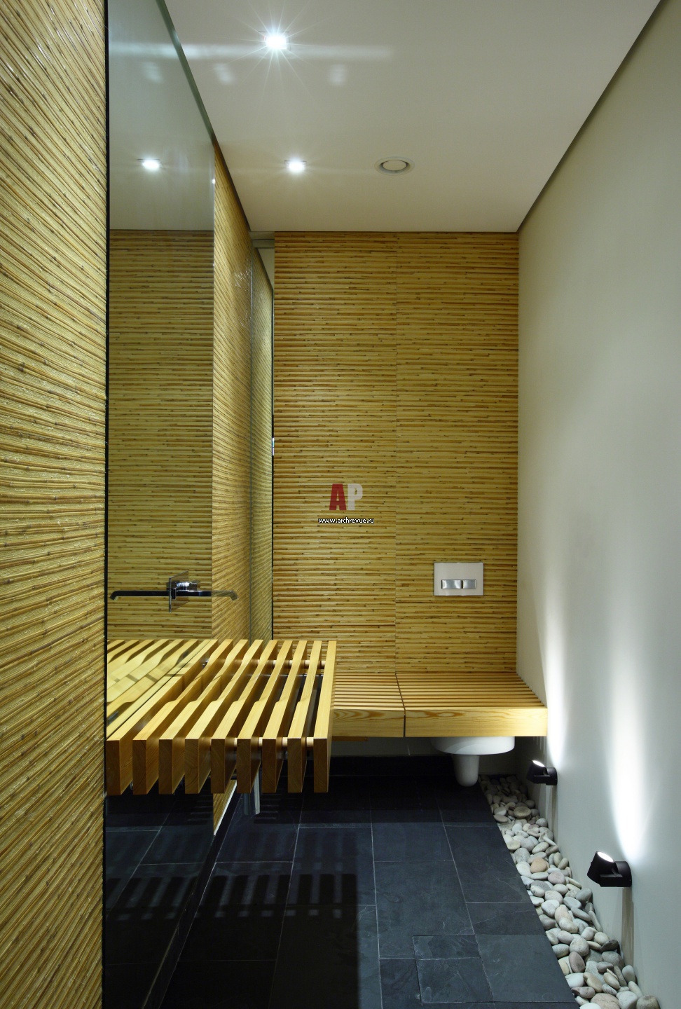 Санузел при бассейне. Раковина и унитаз с декором из деревянных реек, Rapsel. Стены оформлены обоями с фактурой бамбука.