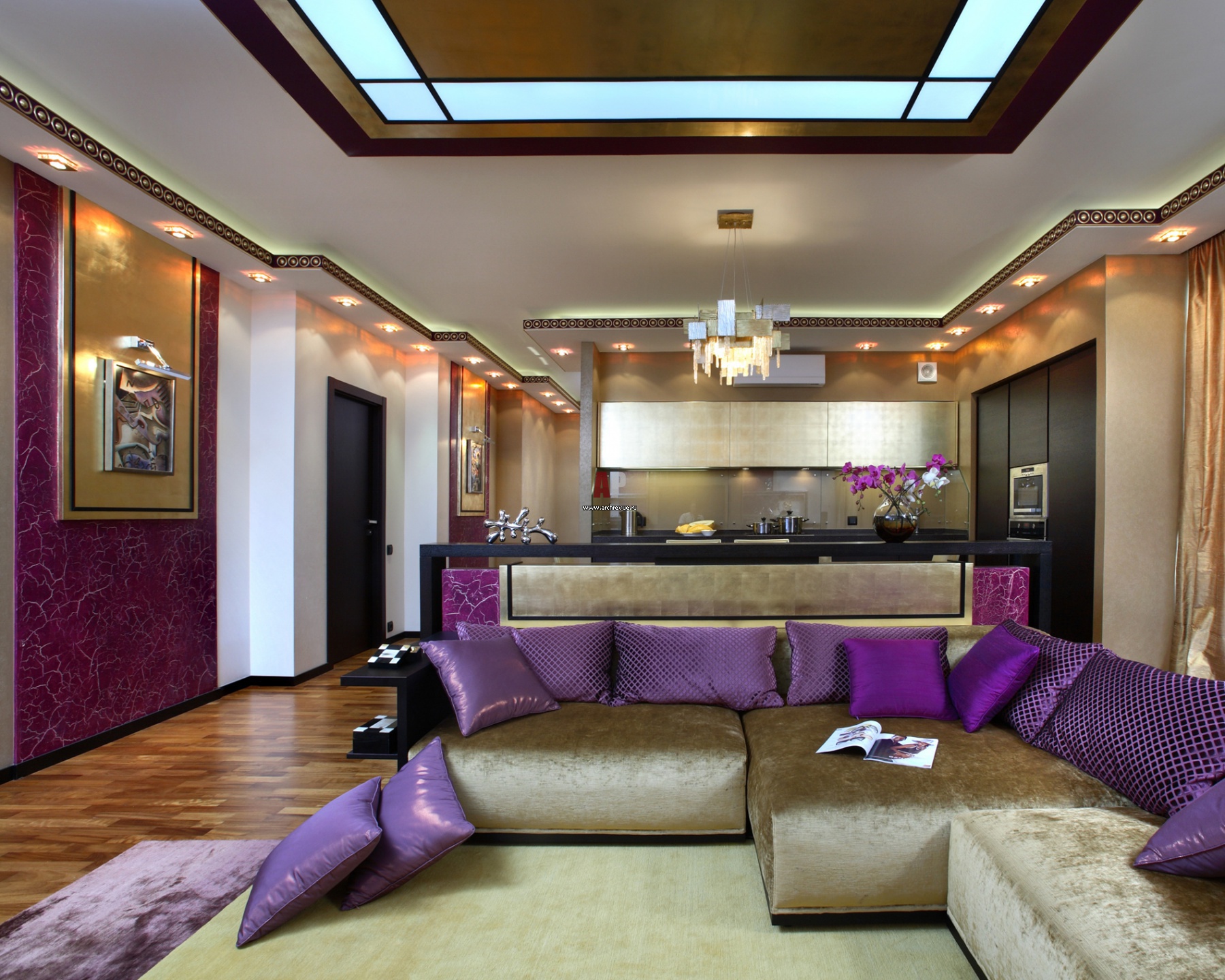 Центральный элемент гостиной – большой диван Arketipo, обитый шёлковым бархатом, нестандартных габаритов, с глубокой угловой частью. Стена украшена золотой поталью и многокомпонентной штукатуркой лилового цвета с кракелюрами.