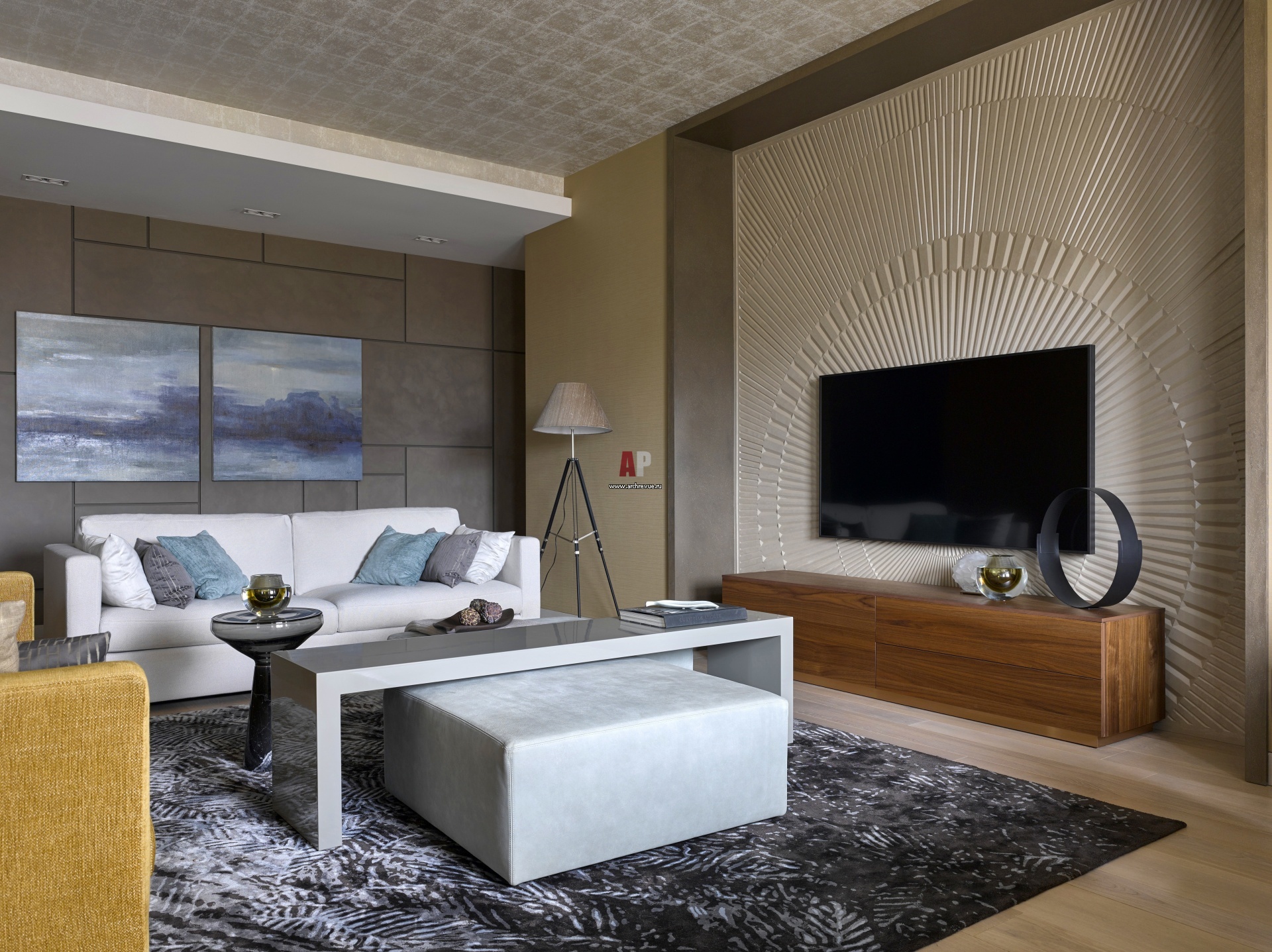 В интерьере гостиной дизайнер сделала ставку на простые формы и близкие цвета, но использовала разные фактуры: эффект замши, рельефное панно, текстурированные обои, имитация камня, поталь. Диваны, консоль, пуфы, Meridiani. Столик, Draenert.