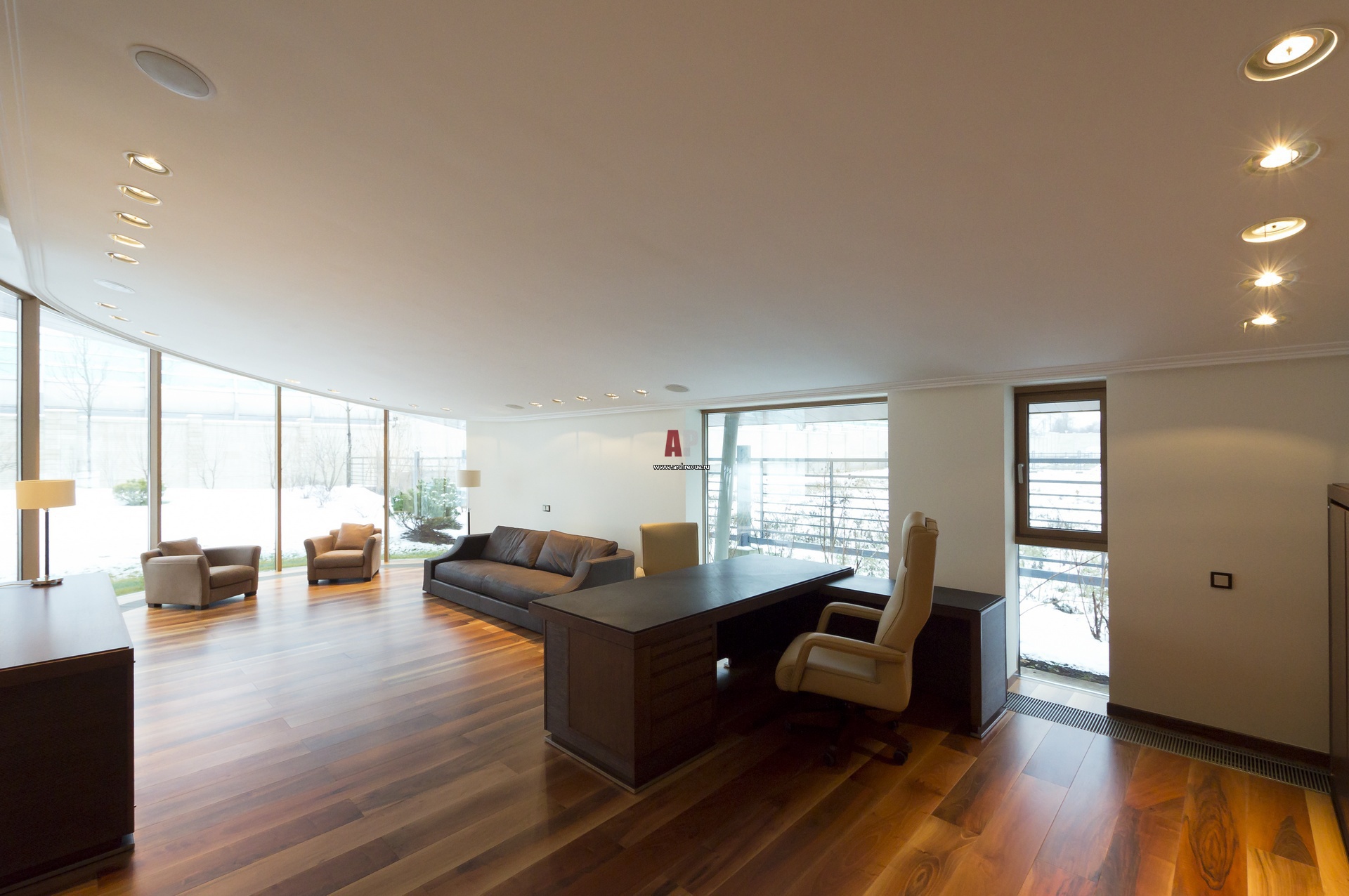 Кабинет хозяина на первом этаже. Потолок подшит гипсокартоном.