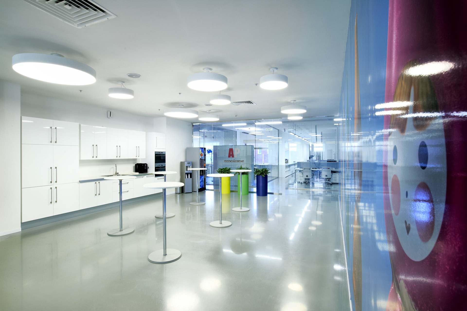 Полы в офисе – наливные. Их сначала покрыли особой краской, а затем несколькими слоями полиуретана для достижения эффекта глубины.