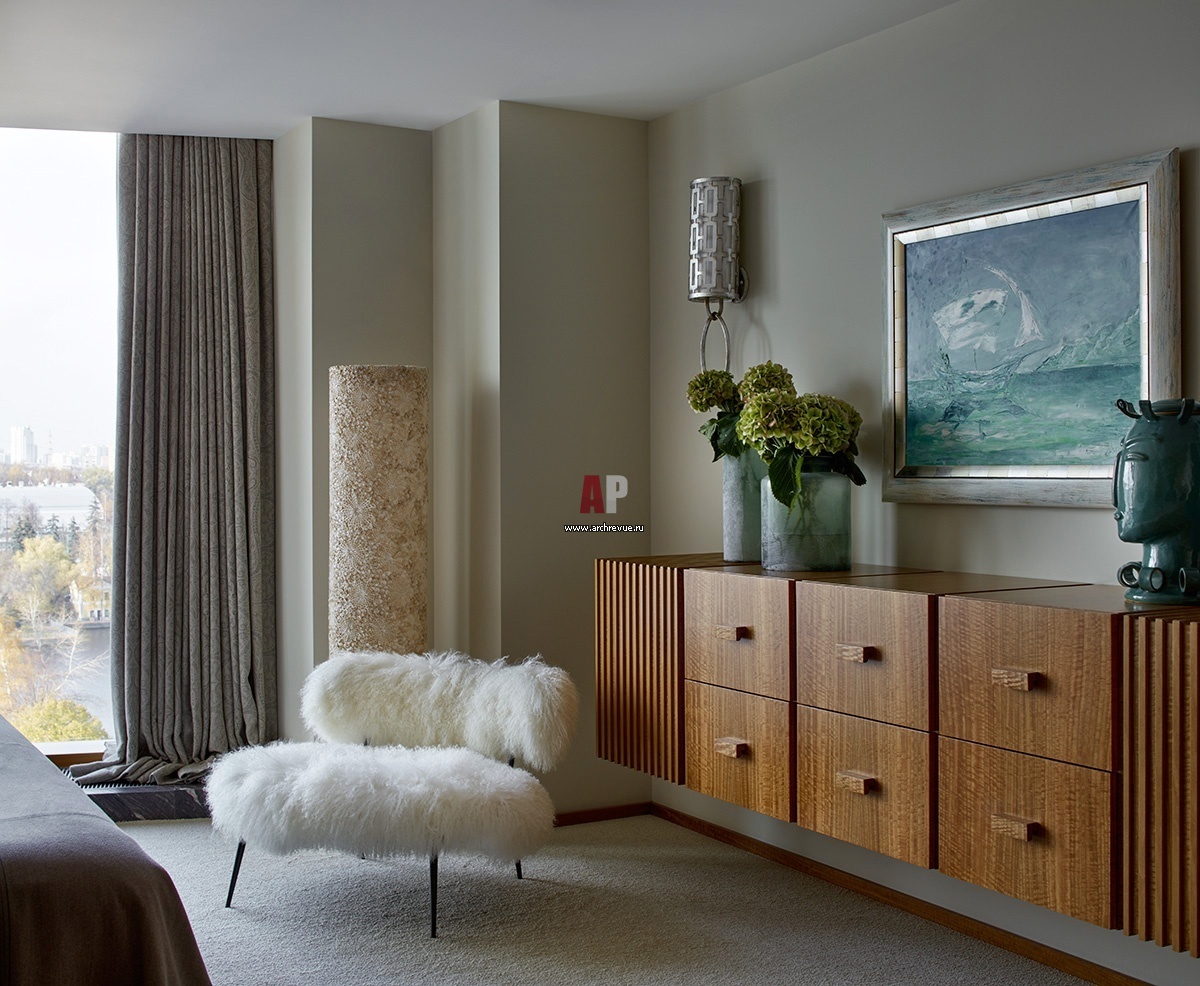 Комод в спальне сделан на из экзотического дерева в российской мастерской. Кресло, Baxter. Вазы, Woon Stores.