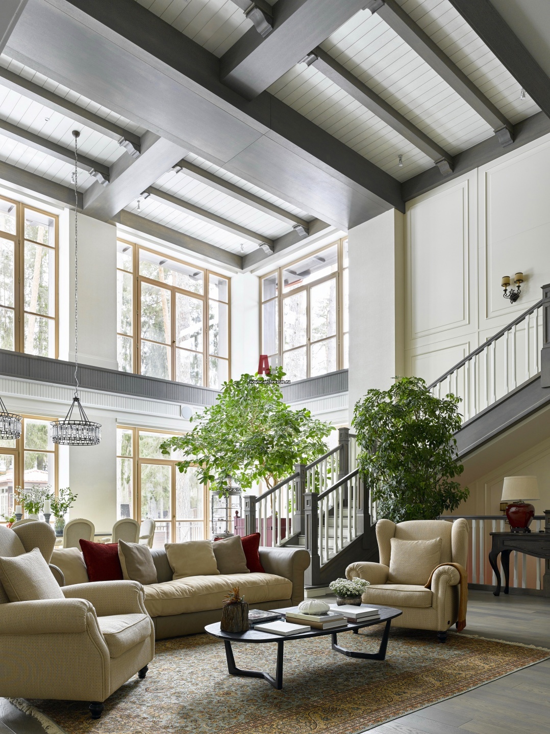 Атмосферу старой дачи в двусветной гостиной поддерживает оформление потолка выбеленной доской и контрастными балками. Стена, примыкающая к лестнице, зашита деревянными панелями теплого светлого оттенка. Ограждение лестницы выполнено из дуба, тонированного в серо-дымчатый цвет.