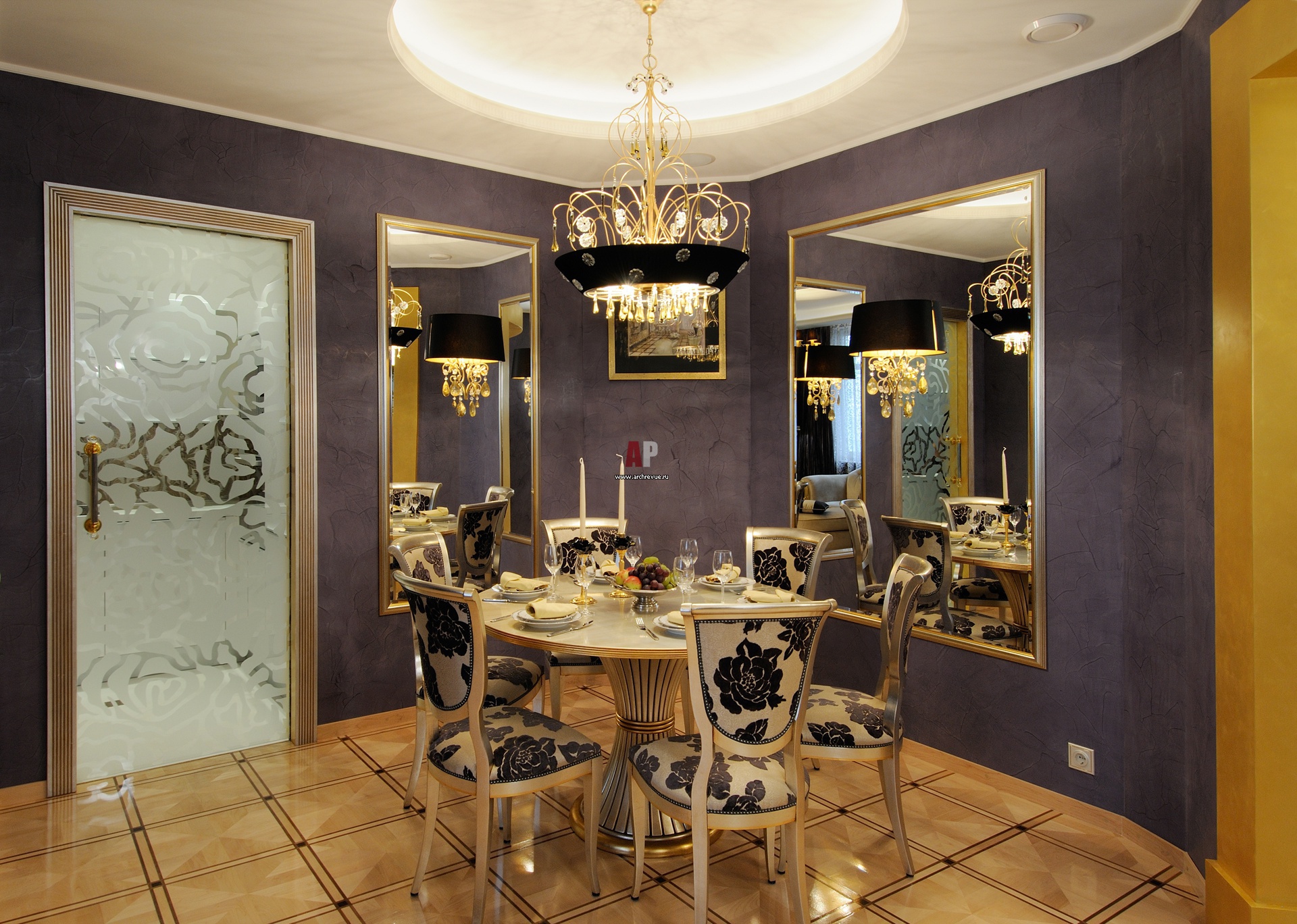 Стулья для обеденной группы авторы проекта заказывали в Италии, ткань для обивки с изображением роз, в Англии, и уже в Москве их перетягивали специалисты компании «Европейская коллекция». Рисунок этой ткани лег в основу орнамента стеклянной двери на кухню. Эскиз с розами авторы отправляли итальянским мастерам фабрики DO:DIA, поставщик «Этерна», где те наносили его на стекло пескоструйным методом.