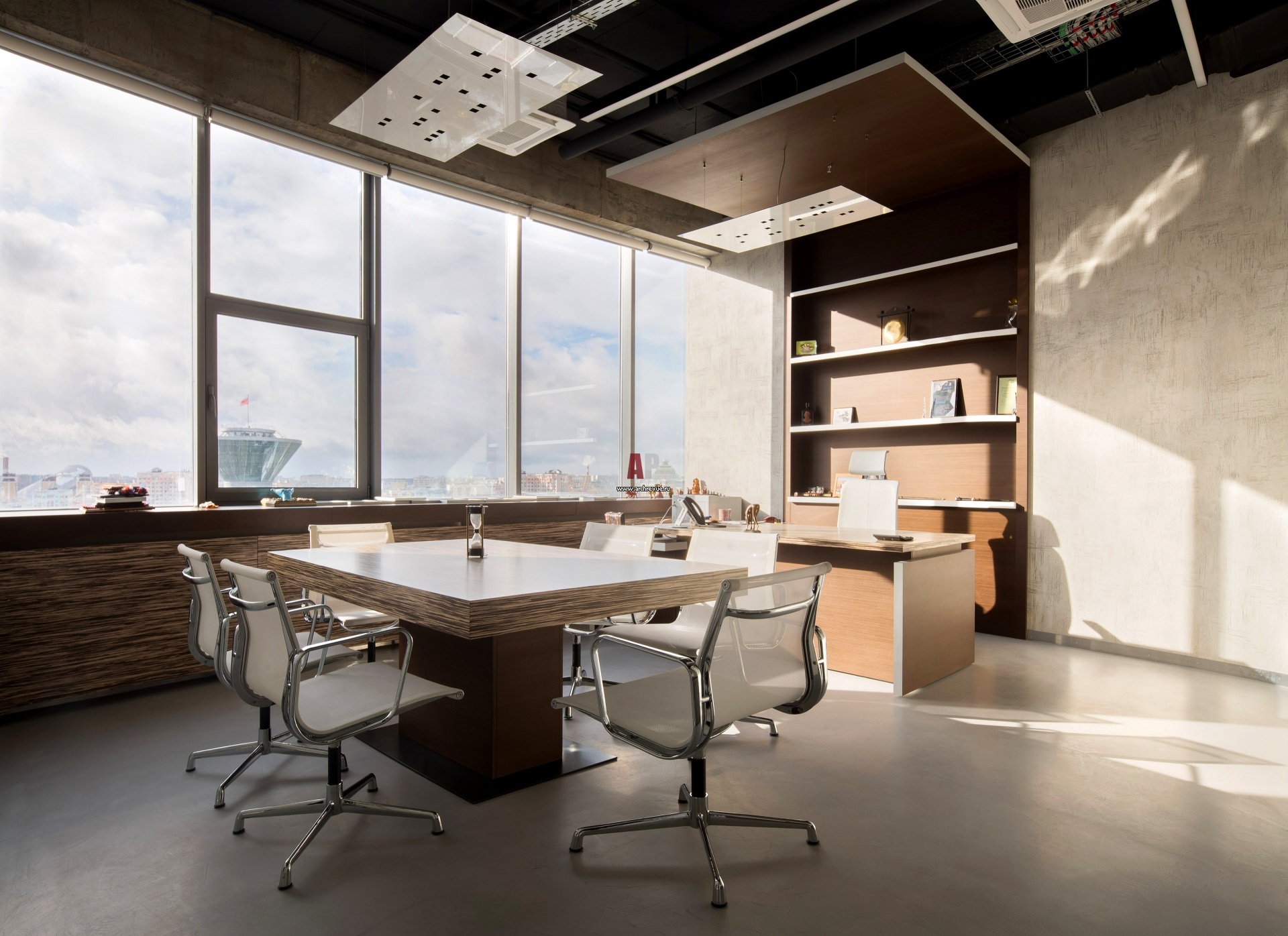 В кабинете заместителя руководителя использована авторская мебель и стеновые панели из дерева. Фактура дерева добавляют интерьеру уют и респектабельность.