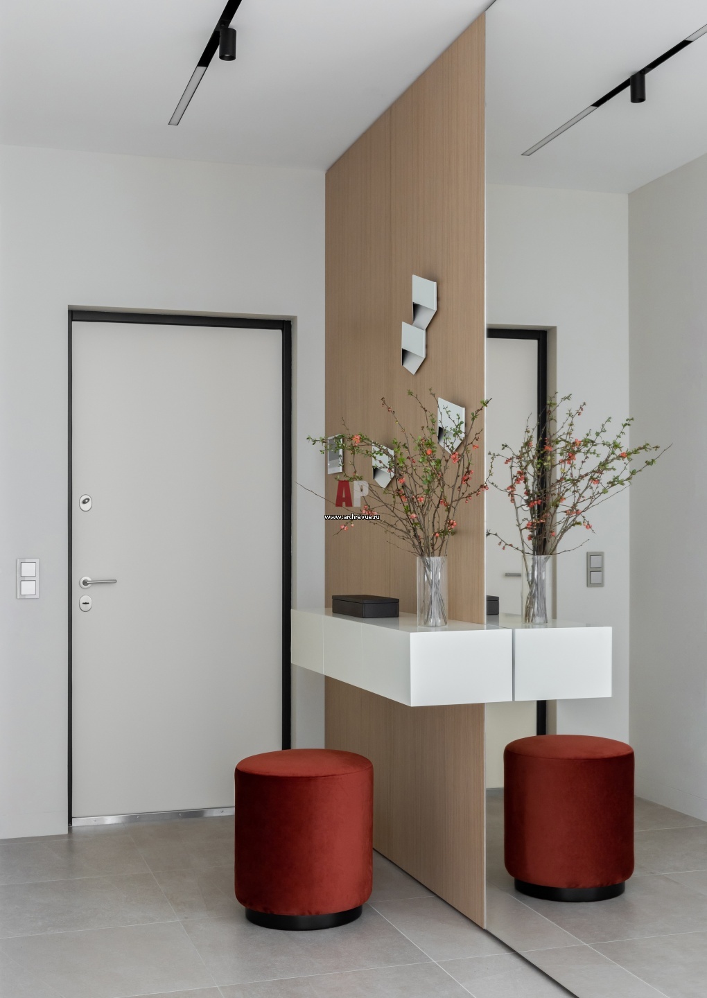 Светлый интерьер в высотке. Прихожая. Банкетка, консоль и зеркало сделаны на заказ. Бра на зеркале, Vibia.