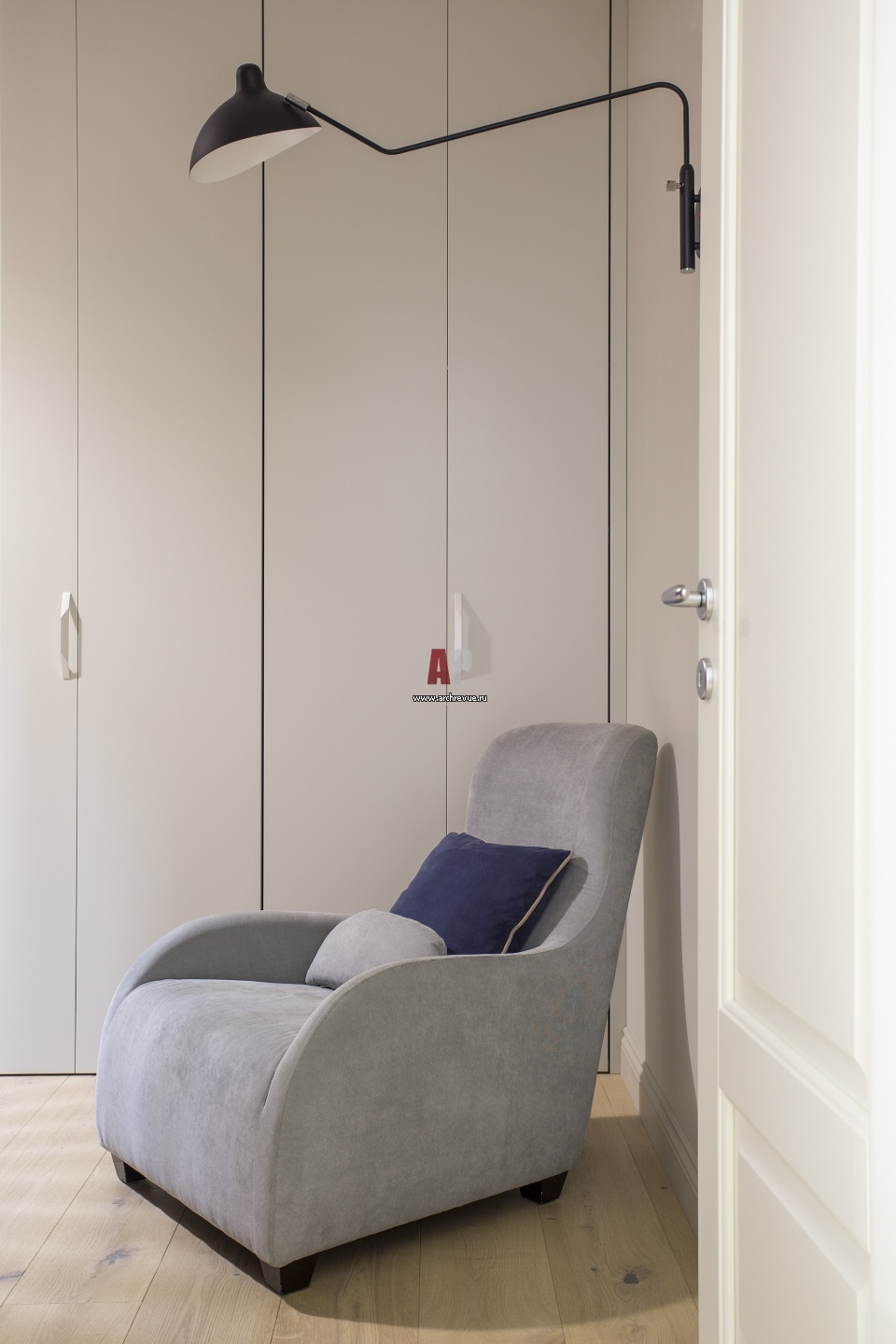 Интерьер гостевой спальни. За встроенным шкафом скрыта гладильная система. Пространство глубиной 70 см оснащено встроенной подсветкой. Каждая дверь набрана из двух узких вертикальных сегментов и складывается гармошкой. Шкаф, МДФ, покраска, изготовление «Столичная Столярная Компания», «Бесст». Кресло, Maxalto.
