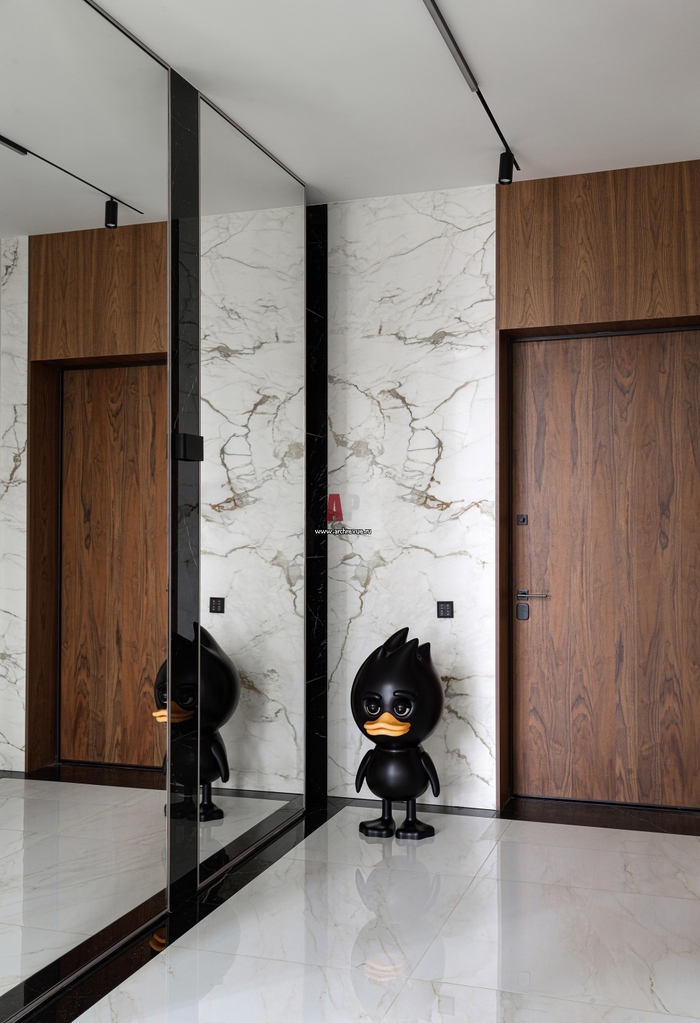 Прихожая. Входная дверь с высоким порталом сделана из шпона ореха. На стенах и полу – широкоформатный керамогранит с фактурой светлого мрамора Calacatta. Зеркала зрительно увеличивают небольшое помещение.