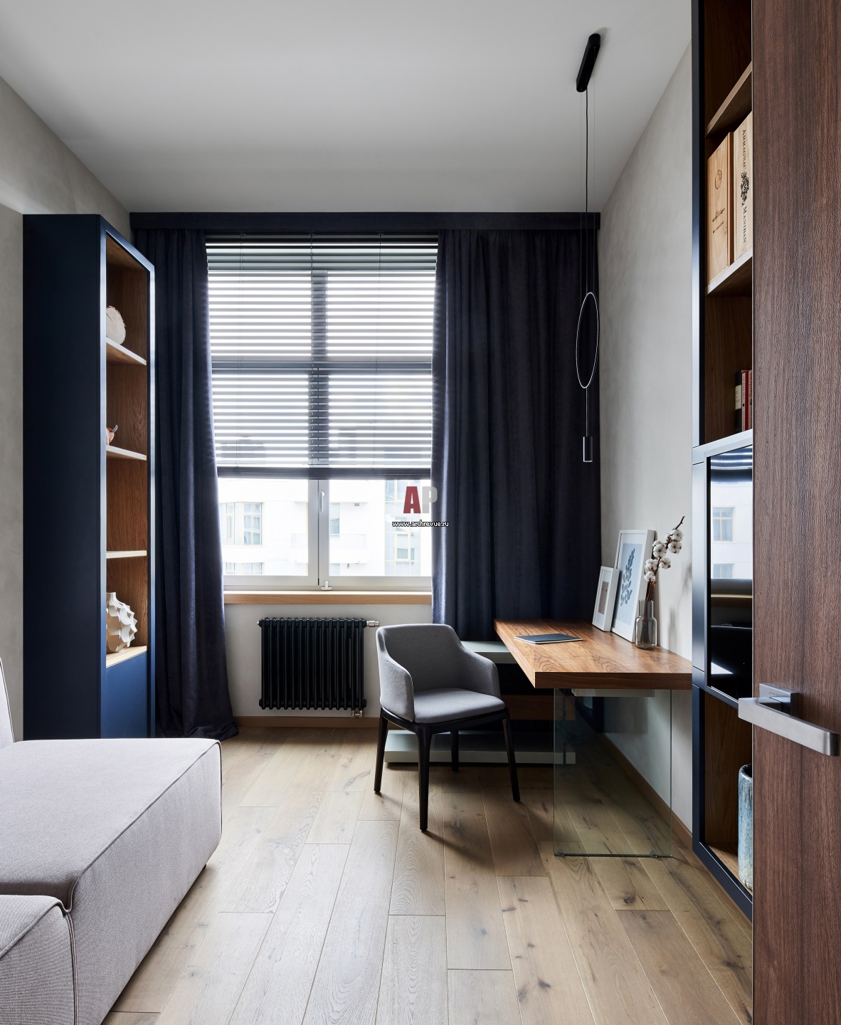 Кабинет. Корпусная мебель изготовлена на заказ по эскизам автора проекта. Диван, Tetto letto. Кресло, Cosmorelax. Люстра, Estiluz.