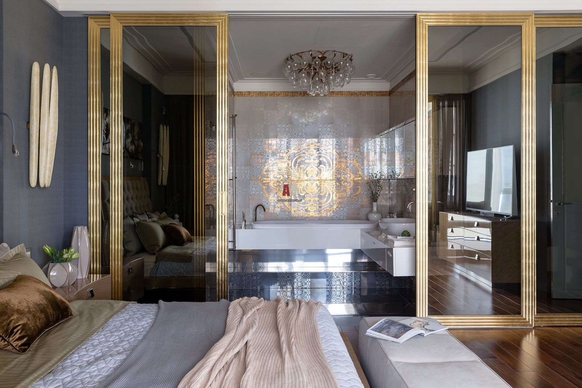 Ванная комната отделена от спальни большими раздвижными дверьми, которые при желании можно полностью закрыть. Полупрозрачные двери Res, серия Deco, стекло Smoky. Душевая и туалетная зона дополнительно изолированы, а из открытой зоны ванной и умывальников через спальню и кабинет открывается панорамный вид на город.