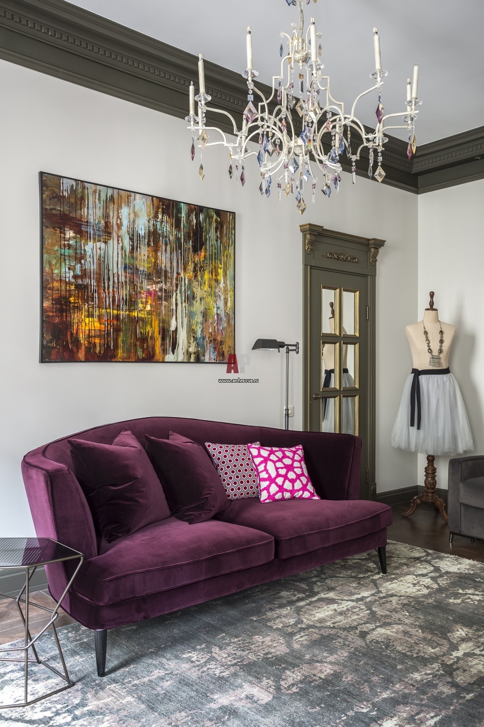 Эклектичный интерьер гостиной. Сиреневый диван, Busnelli, модель Tresor. Столик, Arketipo, модель Rebus. Манекен, Baroque International. Картина над диваном – Андрей Ананьев.