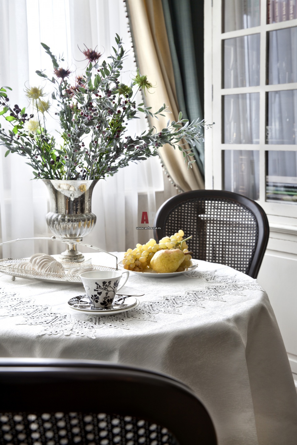 На фото – круглый стол с белой скатертью и кружевной салфеткой.