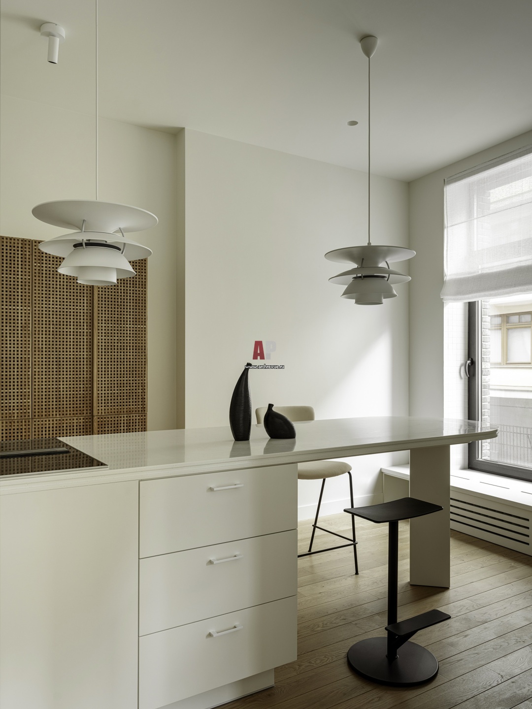 Кухня. От обеденного стола отказались в пользу эффектного острова, плюс есть места чтобы удобно разместиться на подоконнике большой компанией. Барные стулья, Fritz Hansen. Барный табурет, Magis.