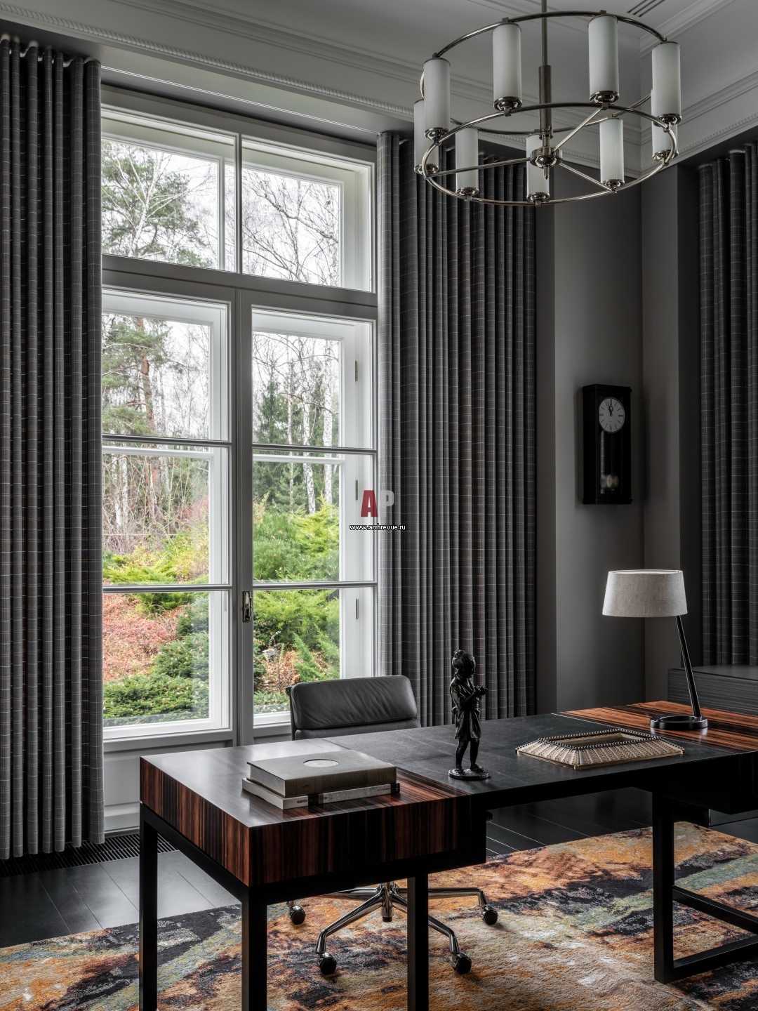 Рабочая зона в кабинете. Рабочий стол, JNL. Кресло Vitra. Шторы, шерсть, Loro Piana.