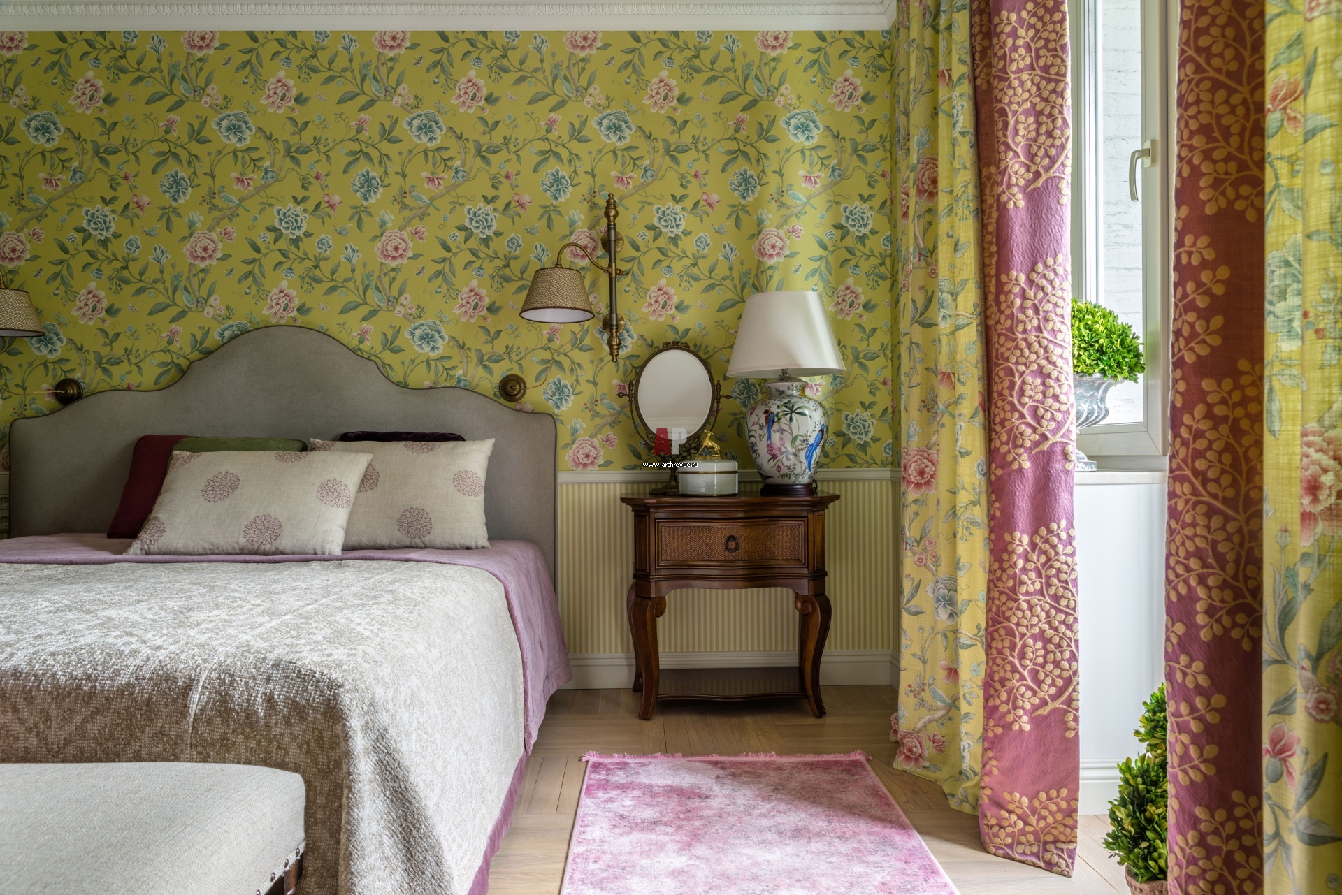 Квартира в средиземноморском стиле. Интерьер спальни. Обои и ткани с цветочным орнаментом, Sanderson. Кровать, Dream Land. Тумбочки, Hooker.