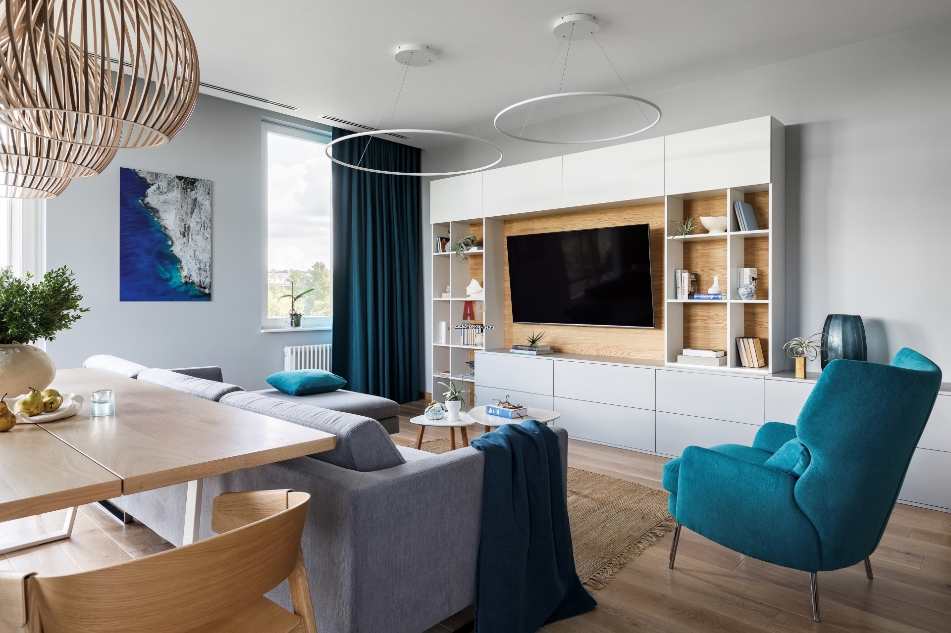 Стены в гостиной выкрашены в нейтральный серый оттенок. Мебель – светлый дуб и МДФ с эмалью. Акцентный цвет здесь – насыщенный бирюзовый. Интерьер украшают воздушные растения-тилландсии, которые могут жить без почвы.