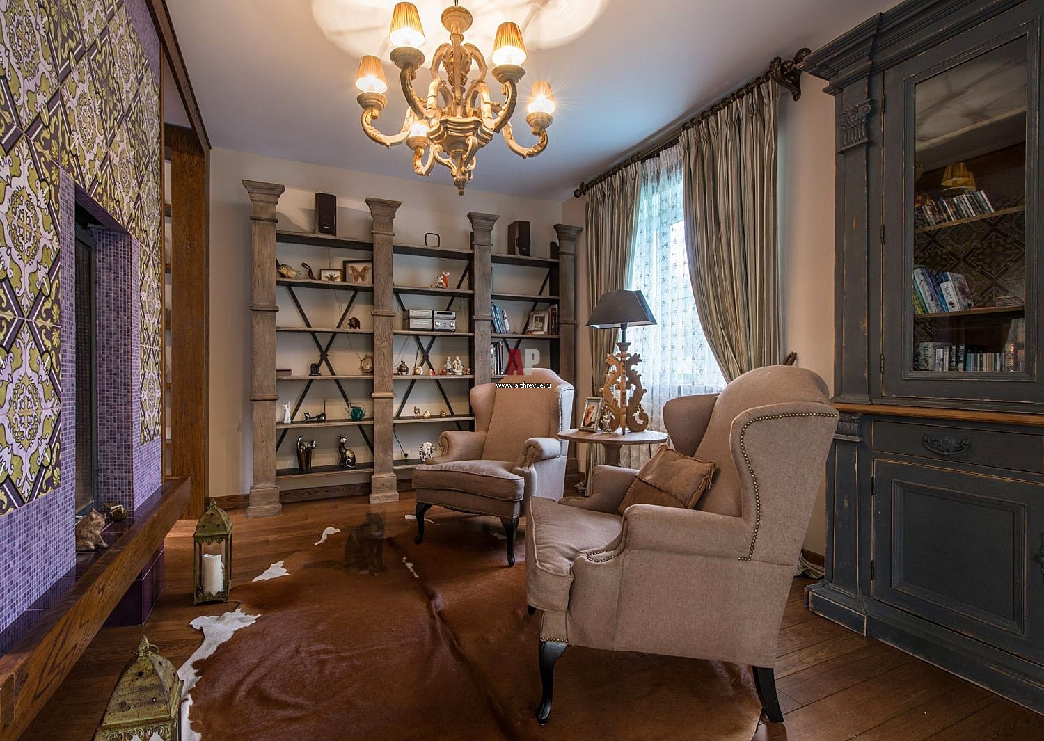 Зона библиотеки у камина. Стеллаж Eichholtz. Состаренный шкаф, Dialma Brown. Вся мебель – поставщик «Москва-Рим».