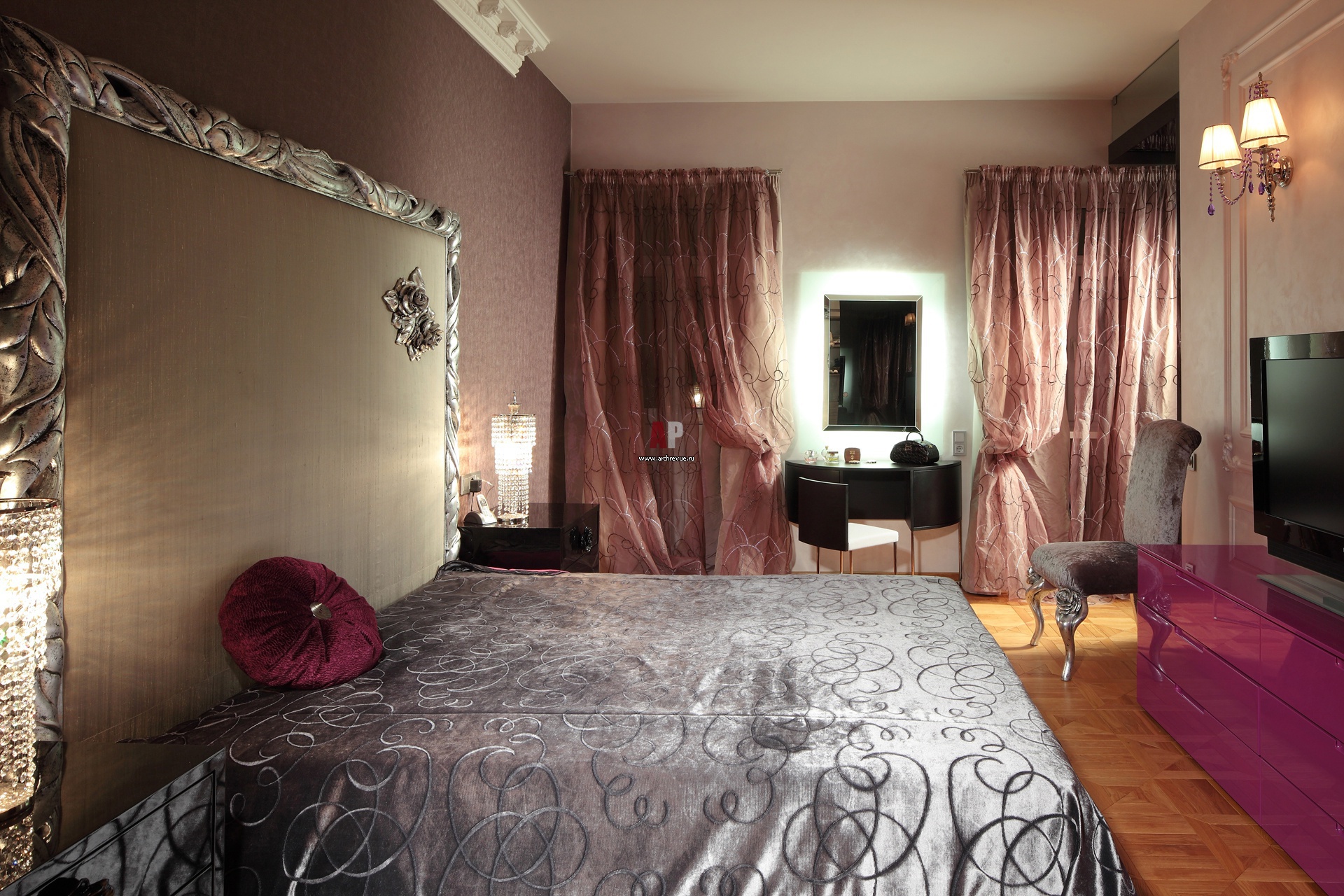 Стиль гламур в дизайне интерьера женской спальни с будуаром. Небольшой туалетный столик с закругленными углами расположен между двумя окнами. Окна декорированы полупрозрачными шторами из ломкой тафты. Тумба под ТВ – цвета фуксии с глянцем.