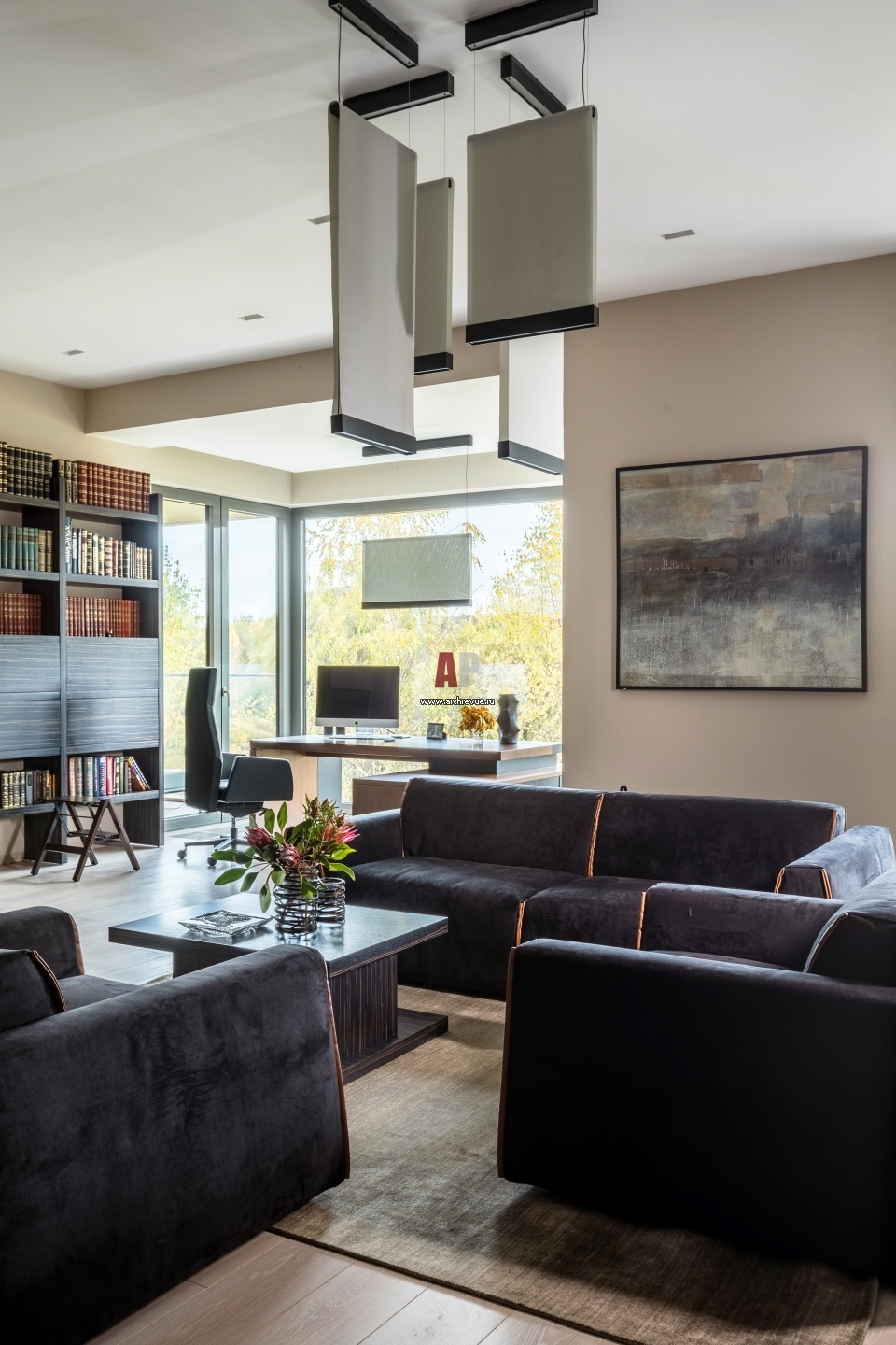 Вид из библиотеки на кабинет в стеклянном эркере. Потолочный светильник, Vibia, модель Curtain.