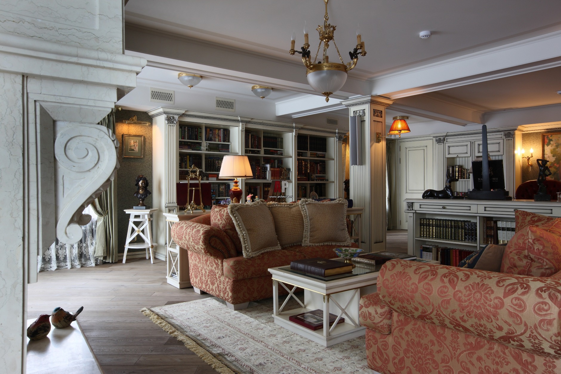 Помещение библиотеки имеет французский флер благодаря выбеленному и деликатно украшенному серебром дереву.