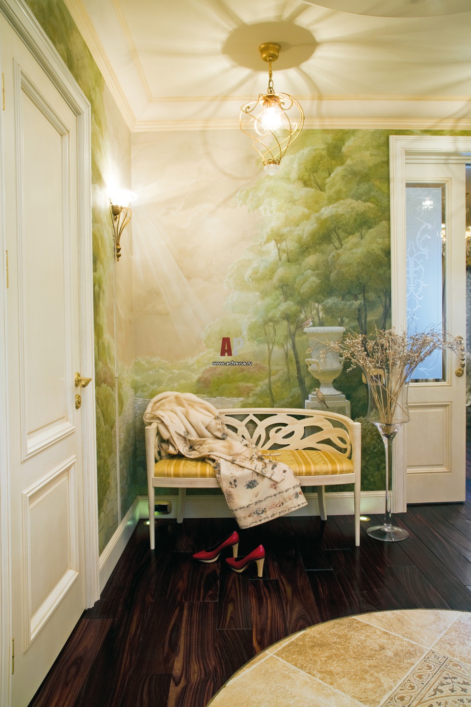На фреске в прихожей изображен романтический парк с античным вазоном на первом плане. Кушетка в стилистике ампир. Светильники и стеклянная ваза дополняют образ уютного садового уголка.