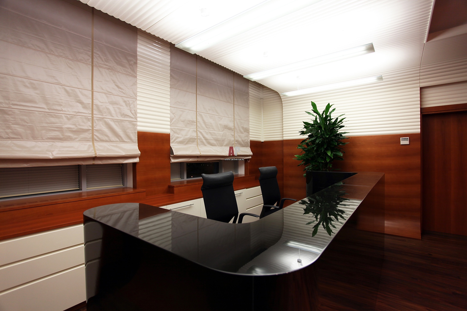 Зона рецепции выделена панелями, загнутыми по радиусу от пола до потолка. Стойка ресепшен выполнена из черного кориана.