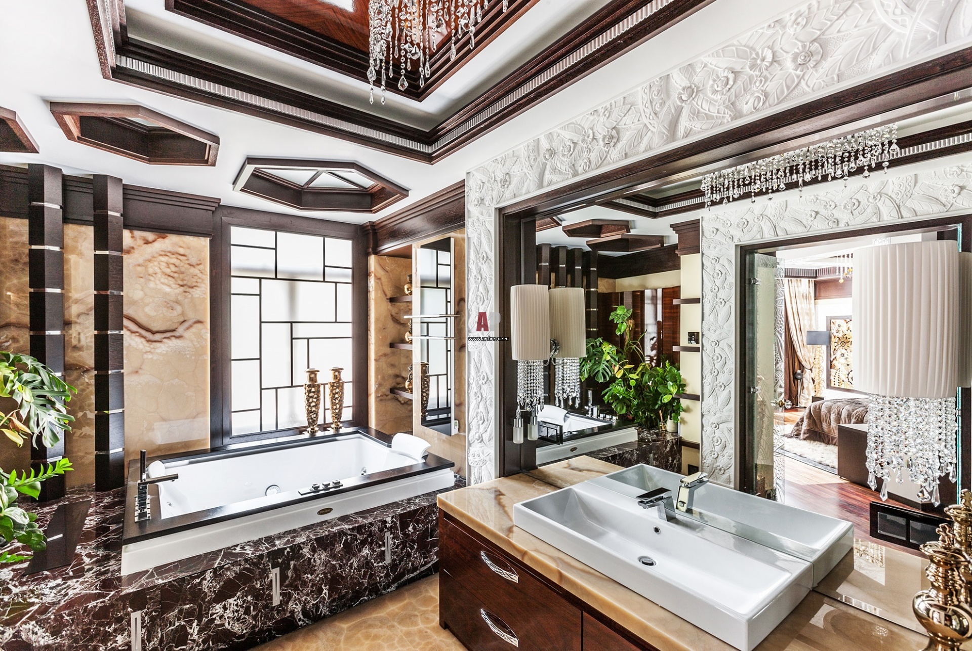 Интерьер ванной комнаты при хозяйской спальне в отделке ониксом, мрамором и лепным декором с цветочной тематикой. Витражи на потолке и окне в форме шестигранников и прямоугольников.