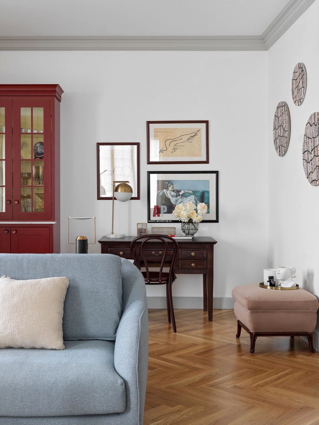 Эклектичная квартира с парижским шиком. Рабочая зона в гостиной. Настольный светильник, Odeon Light.
