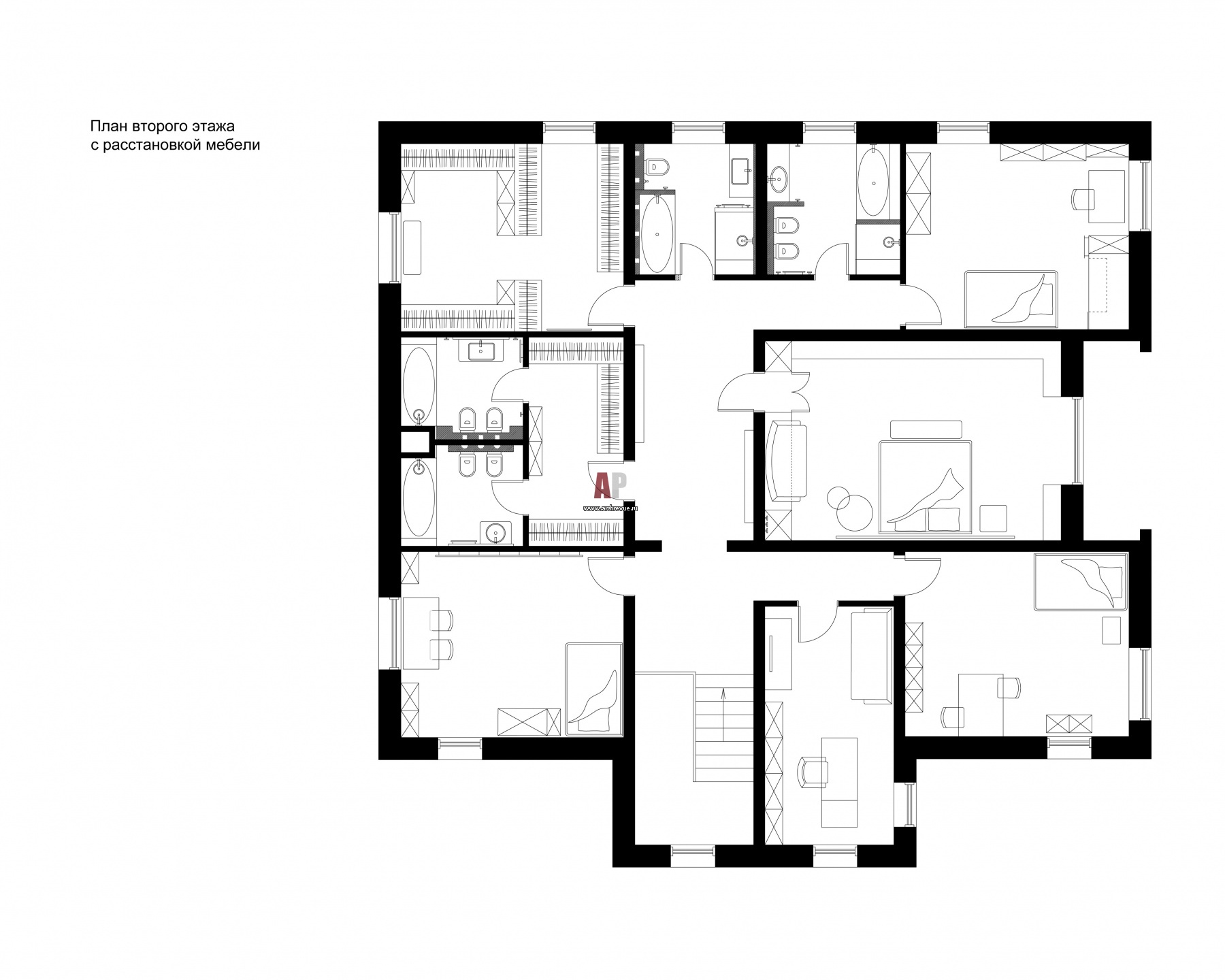 План второго этажа двухэтажного дома, построенного по индивидуальному проекту в поселке «Миллениум Парк». Общая площадь - 650 кв. м.