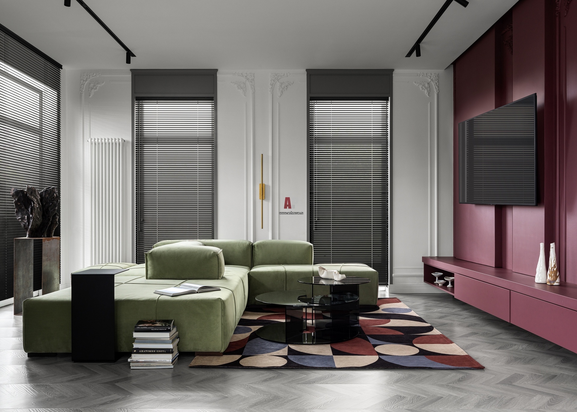Общая гостиная. Стена за ТВ окрашена в насыщенный винный цвет. Декоративные оконные порталы окрашены в темно-серый цвет и визуально корректируют высокое пространство.