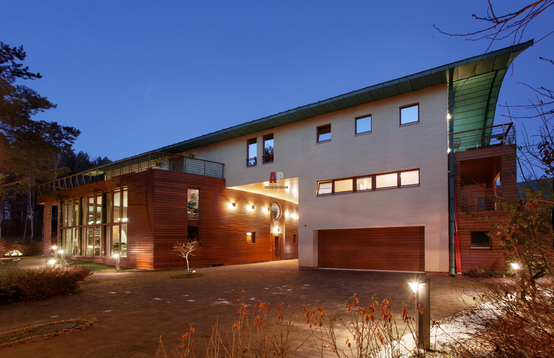 Фото фасада модернистского дома. В отделке использован белый лицевой кирпич и вагонка из лиственницы.