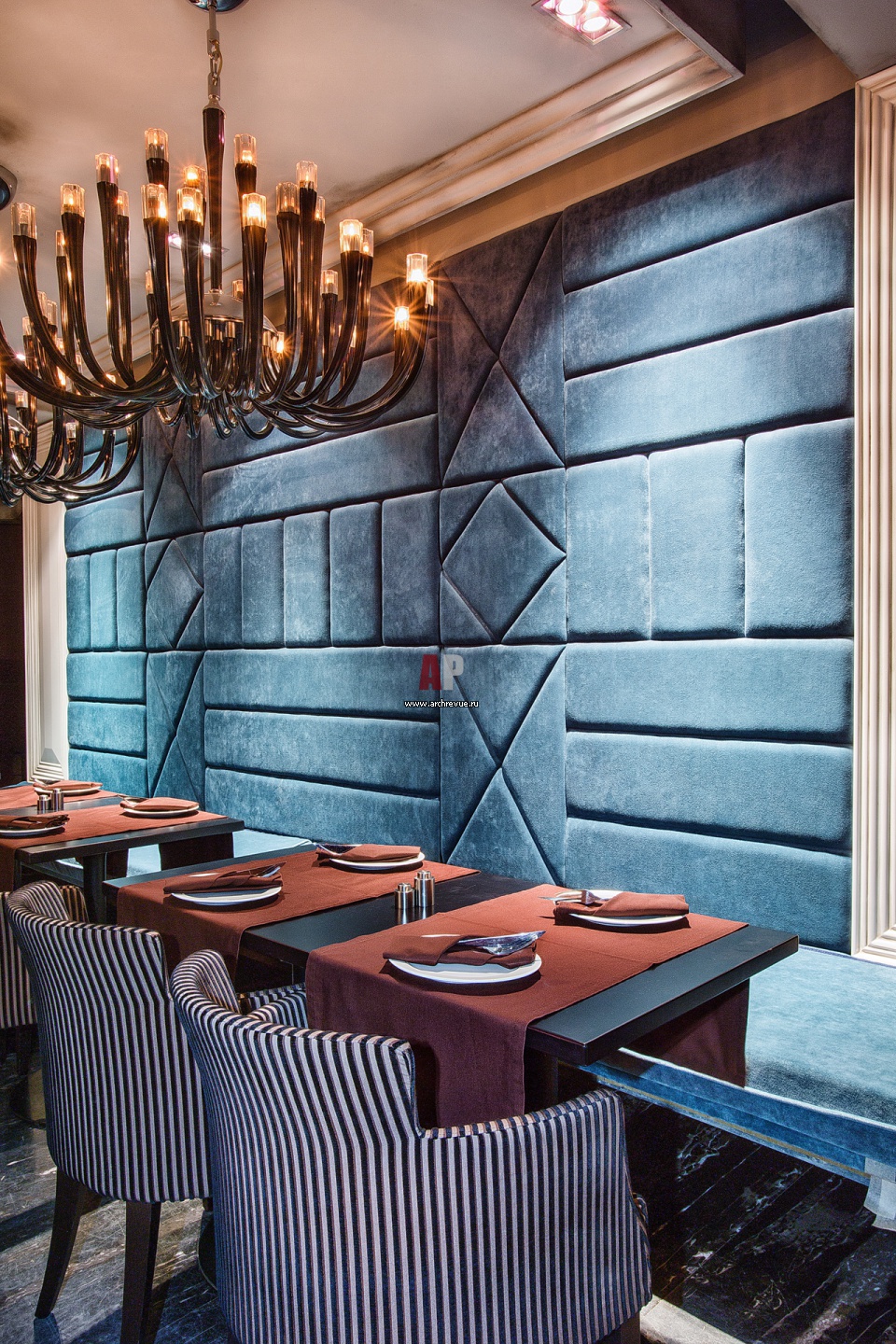 Стены в зоне лаунжа обиты текстильными панели. Они складываются в геометричный орнамент. В отделке использован синий бархат. Черные люстры из муранского стекла.
