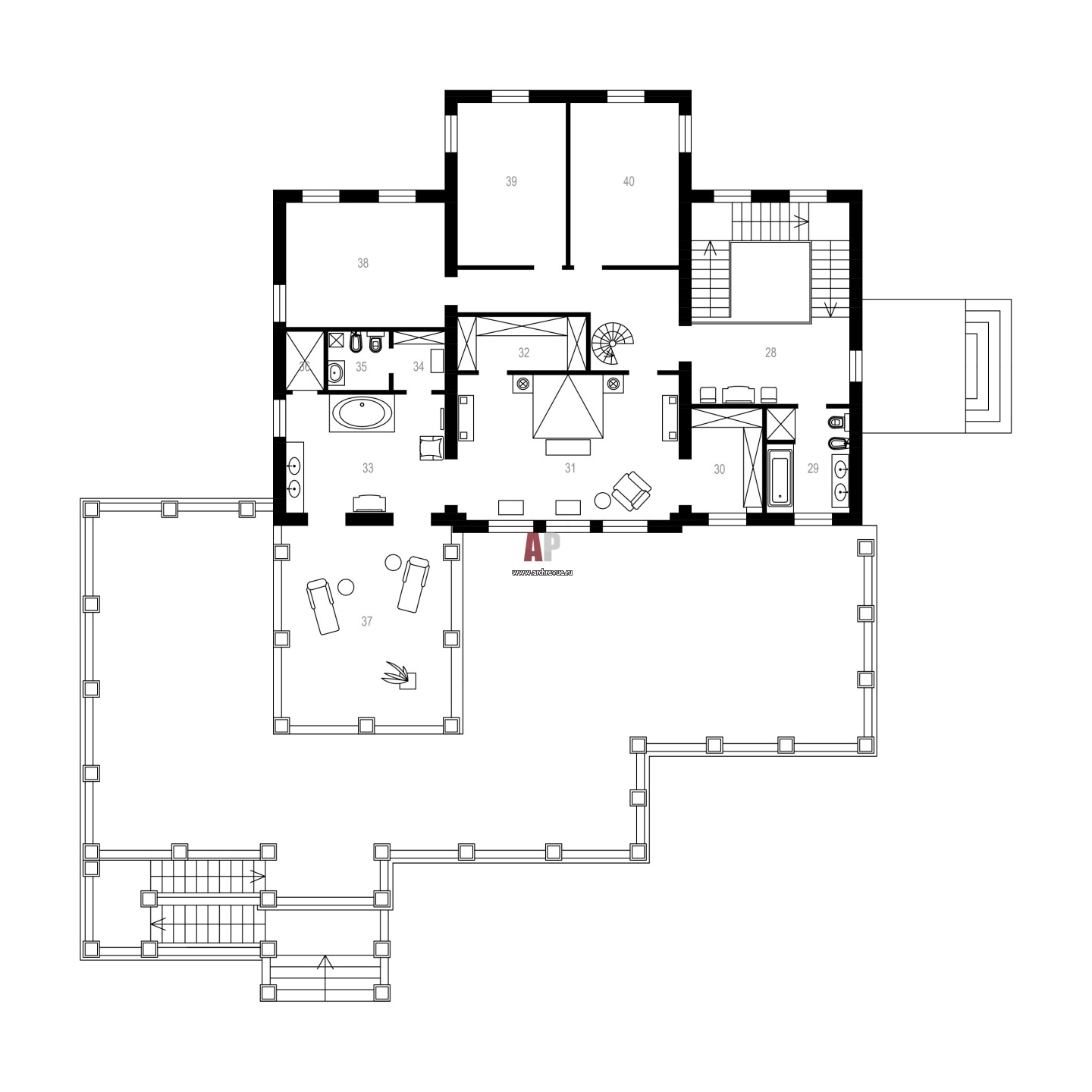 План второго этажа классической семейной резиденции в Юрмале. Общая площадь – 1300 кв. м.