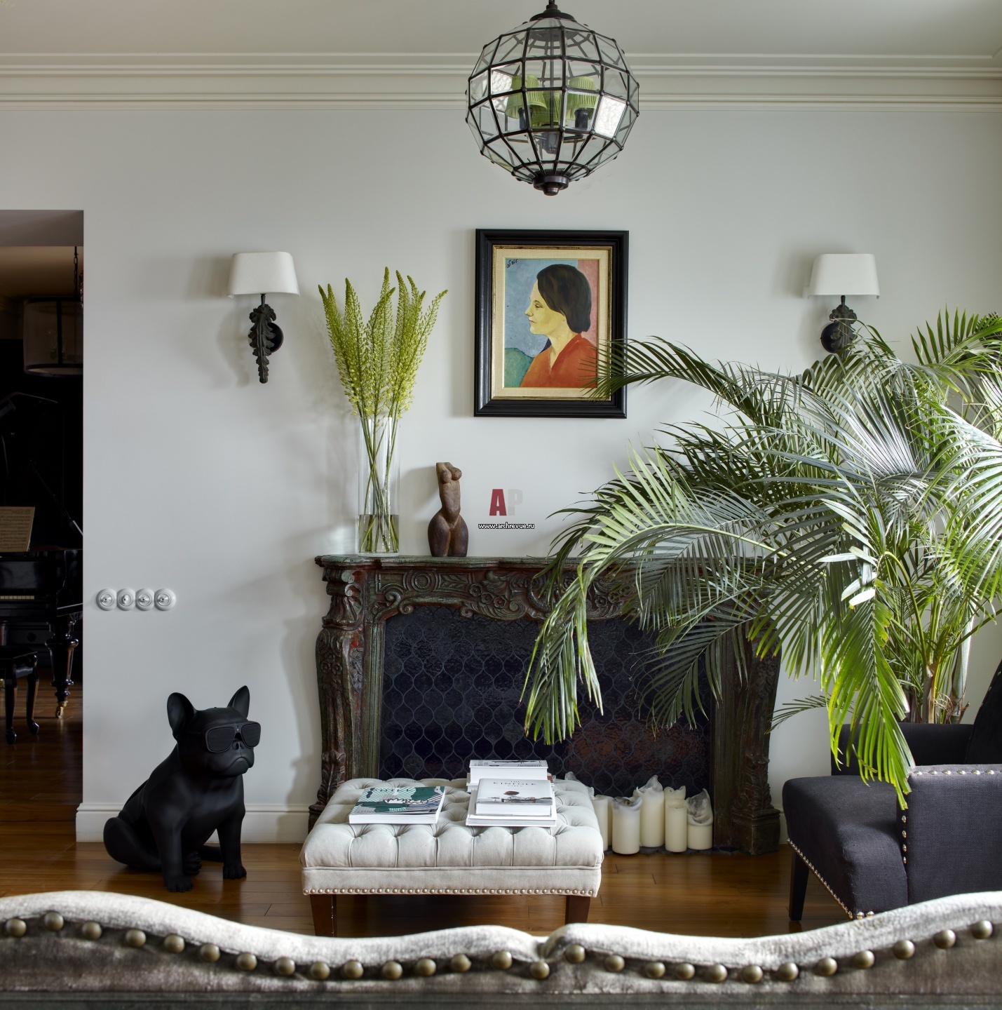 Мансардная квартира в марокканскими мотивами и неоклассическим камином. Зона гостиной. Диван в обивке бархатом, LeHome.