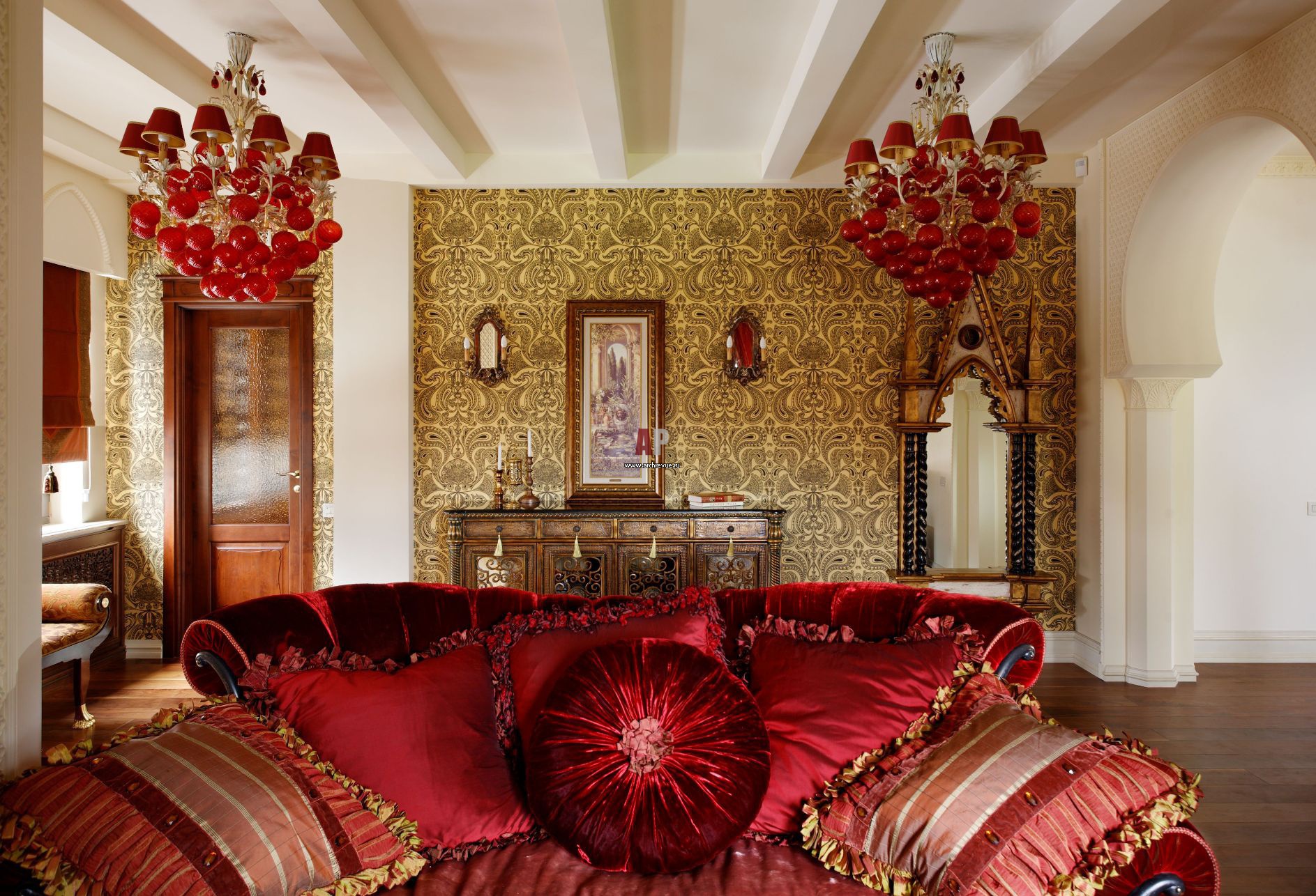 Архитектор признается, что долго не могла подобрать люстры в этот дом. Пока не увидела продукцию фабрики Pataviumart. Яркие люстры с абажурами и подвесками в виде помидоров выгодно контрастируют с восточной стилистикой интерьеров.