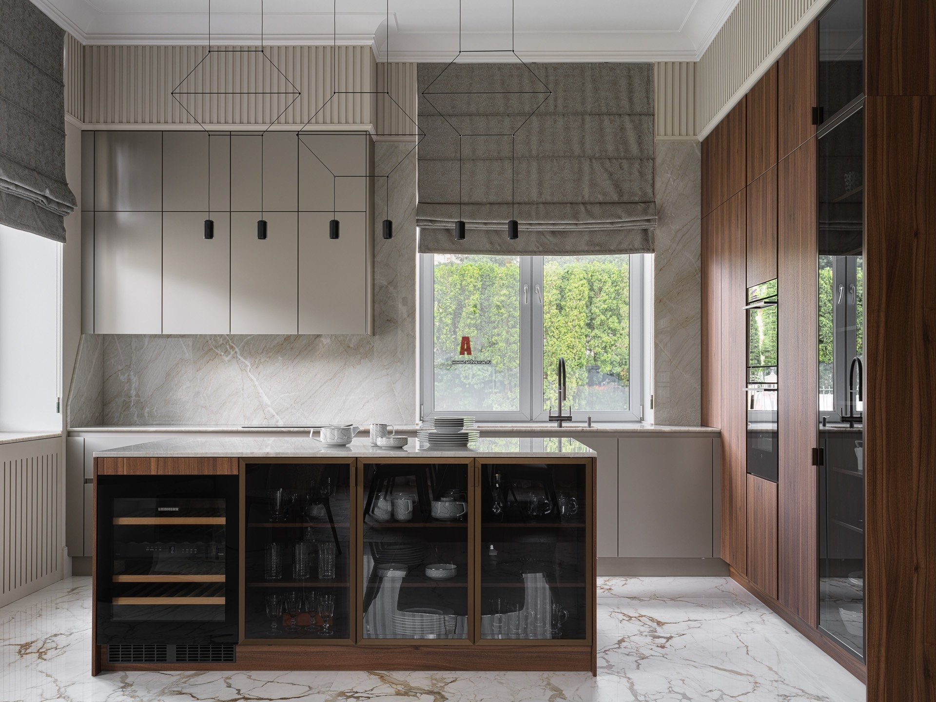Кухня с островом, Leicht. Фасады выполнены из шпона. На полу – мраморная плитка.