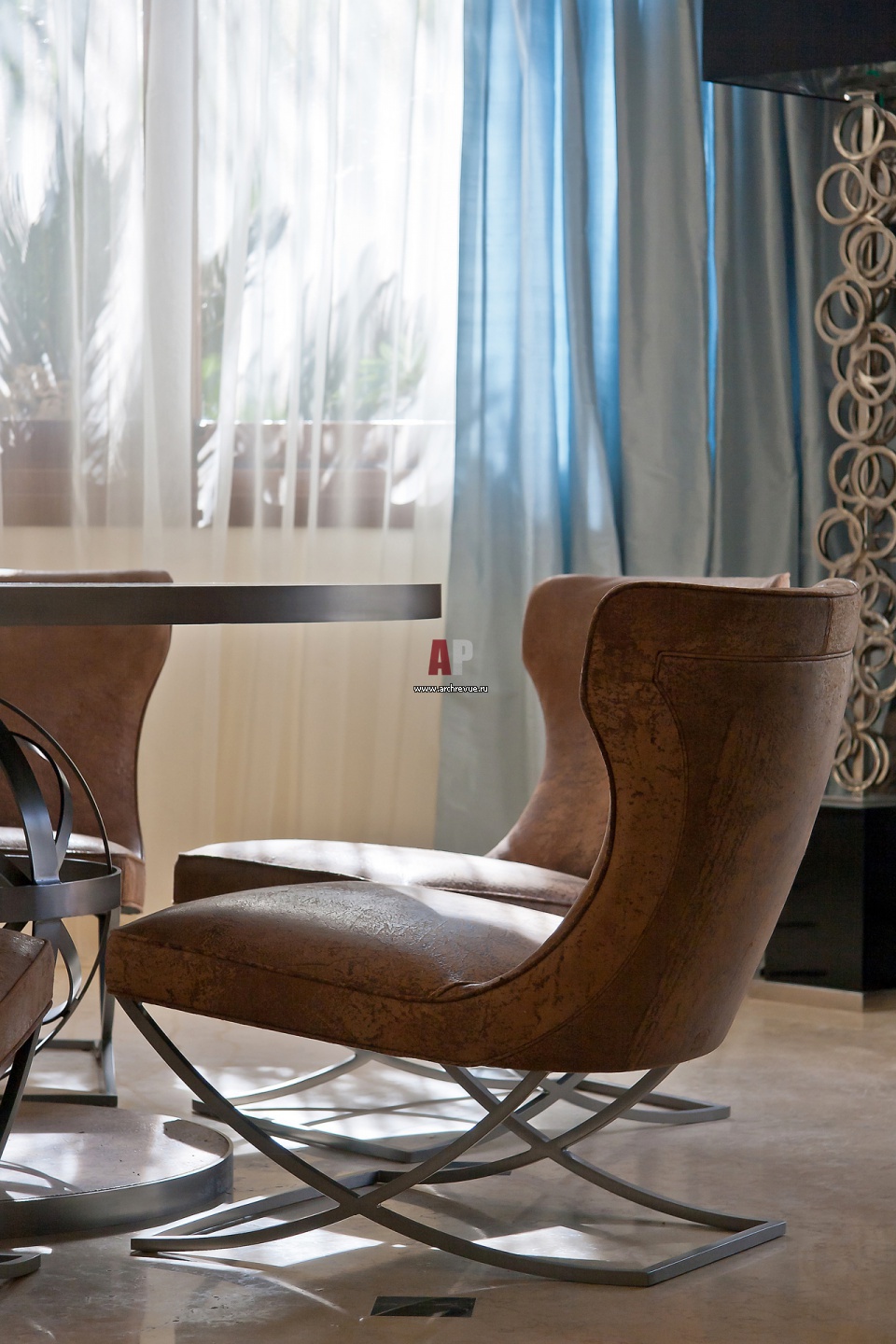 Интерьер общественных помещений дома меблирован дизайнерскими предметами с простой и ясной геометрией из стекла, металла и кожи.