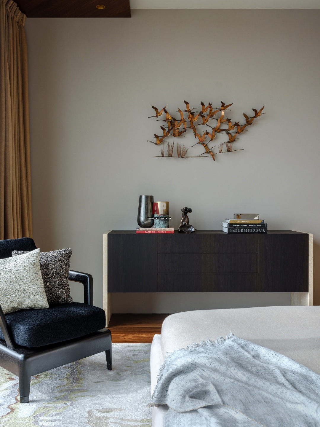 Панорамная квартира на Цветном бульваре. Хозяйская спальня. Комод, Emmemobili. Кресло Minotti в обивке тканью Pierre Frey. Настенная металлическая скульптура «Стая птиц в камышах», авторы C. Freiler и J. Fels, 1970- гг.