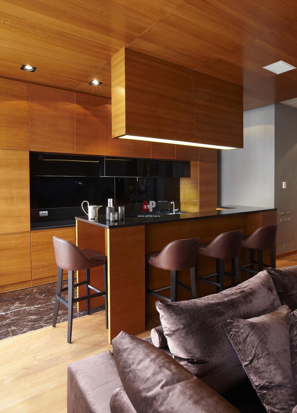 Кухня – смысловое продолжение гостиной. Разные по назначению зоны визуально «собирают» деревянные конструкции. Оригинальный светильник выполнен как прямоугольный объем, он спускается над барной стойкой и также облицован деревянными панелями.