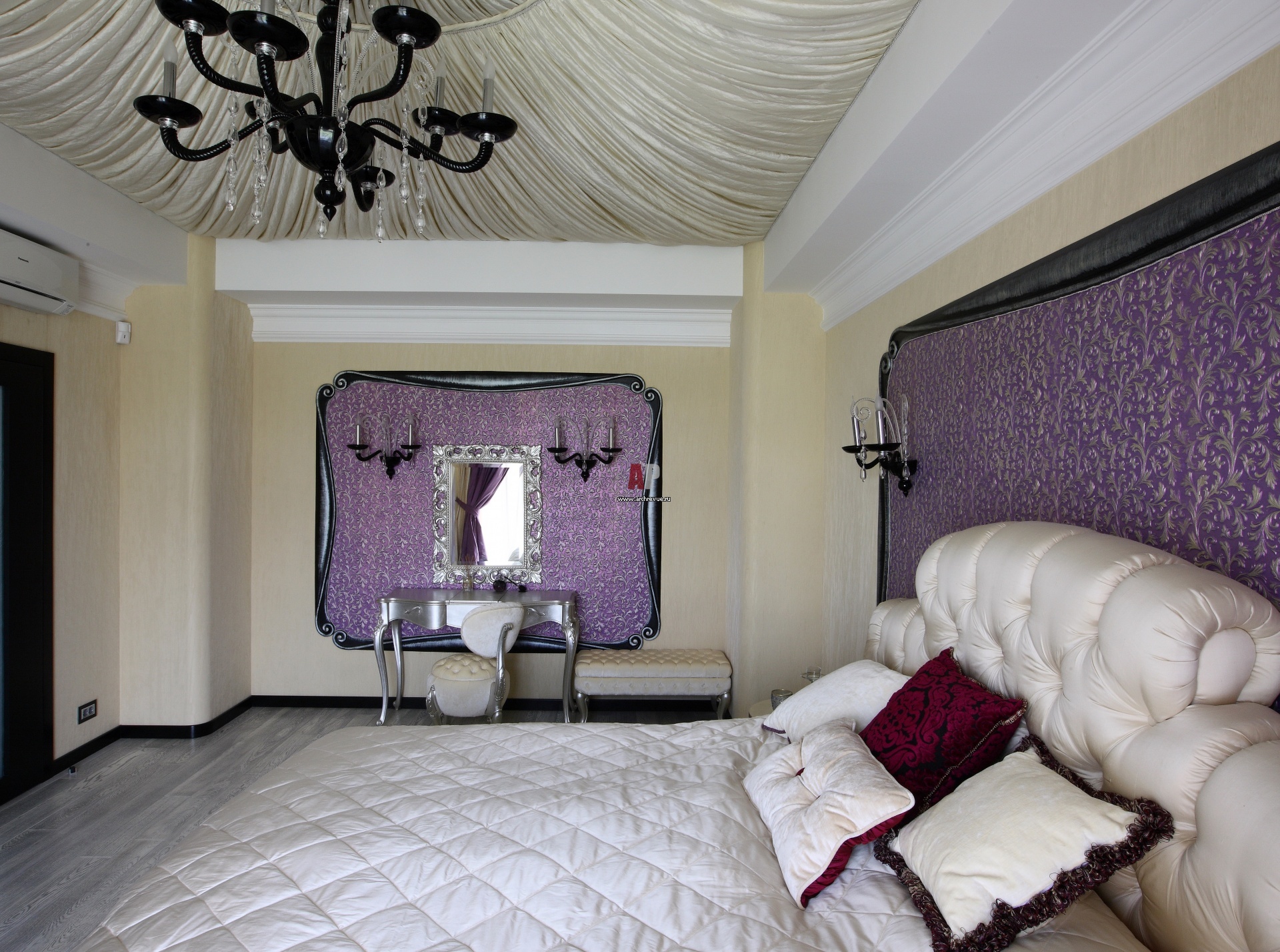 Интерьер спальни с классическими мотивами и сиреневыми акцентами. Примечательные детали спальни – купольный текстильный потолок и рельефные панно в резных рамах с серебрением. Кровать, прикроватные тумбы, Paolo Lucchetta.