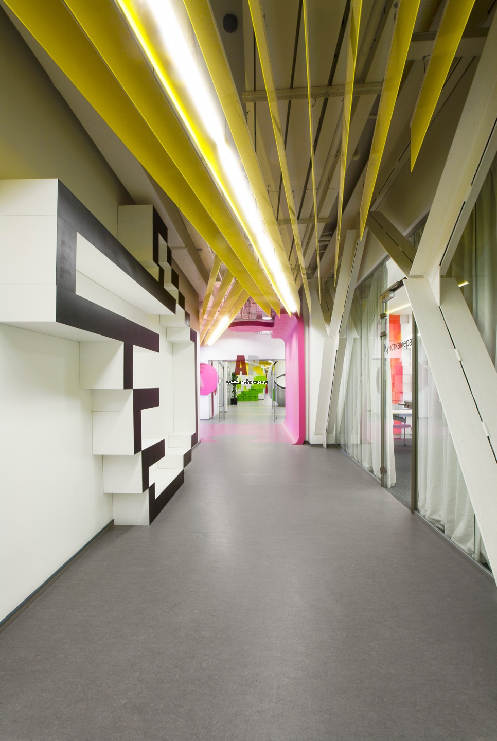 Фото интерьера холла офиса в минимализме. Динамику усиливает оформление потолков желтыми «ламелиями» и светильниками-пунктирами, идущими под углом друг к другу.