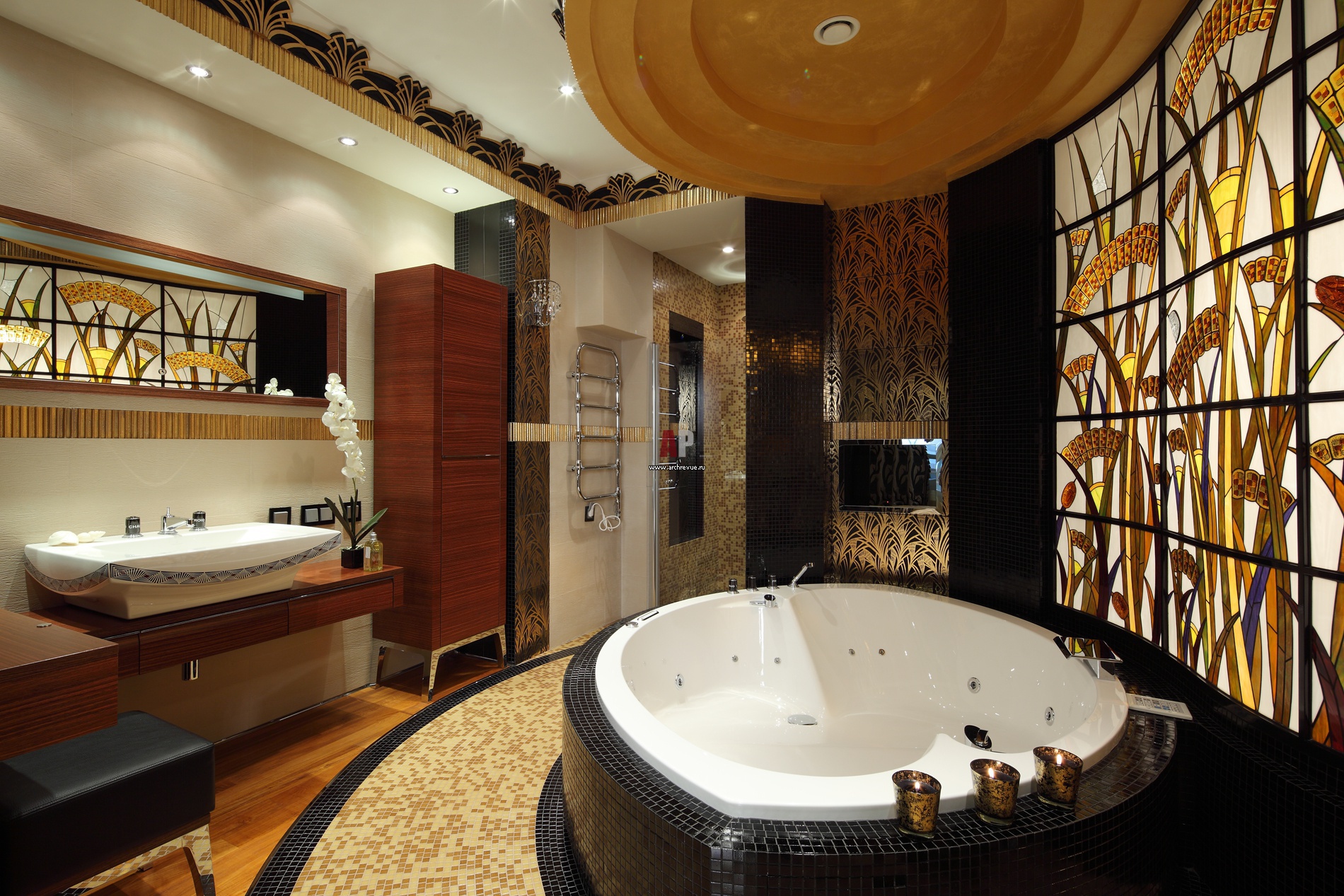 В хозяйской ванной создана парадная атмосфера ар-деко. Растительный орнамент шамотной плитки в золотисто-черных тонах поддержан лепным потолочным карнизом и витражом, изготовленным по эскизам автора проекта. Ключевое положение в пространстве круглой ванны повторяет гипсовая потолочная конструкция.