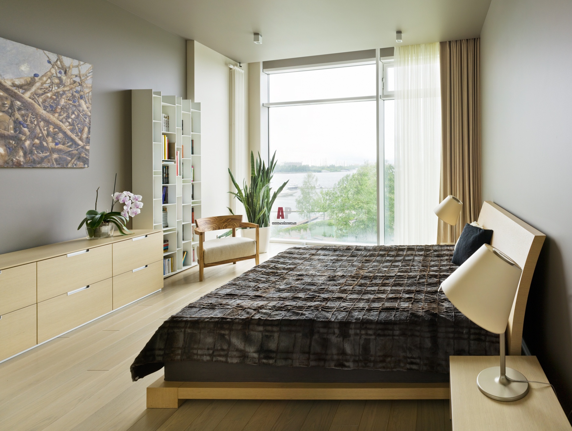 Интерьер квартиры выдержан в экологической стилистке. Стеллаж Longhi, плед на кровати Smania Casa.