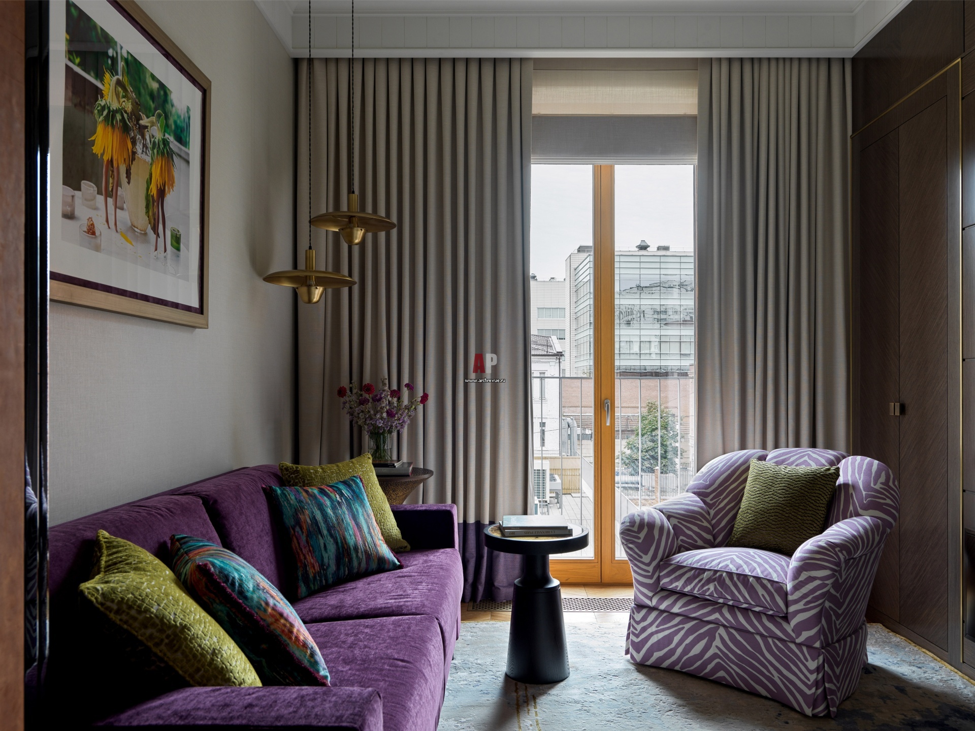 Гостевая спальня задумана как комната для приватных разговоров. На стенах – обои с тиснением. Диван, BK Italia. Металлические столики и светильники-подвесы, Hamilton Conte. Кресло-зебра переехала со старой квартиры заказчицы.