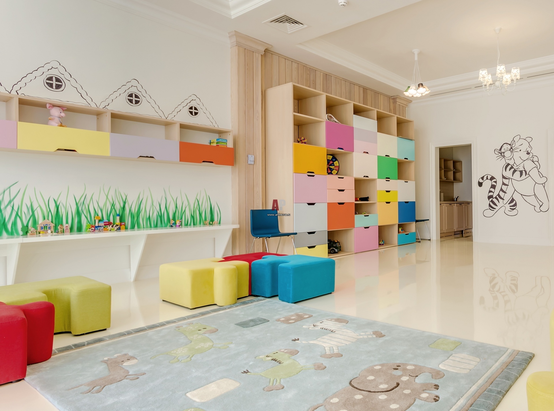 Интерьер игровой зоны для малышей. Стены частично зашиты вагонкой из сосны, покрашенные в цвет выбеленного дуба.