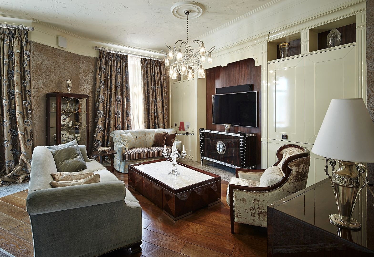 Интерьер гостиной с элементами стилистики ар-деко. Встроенная мебель цвета слоновой кости сделана на заказ. Люстра, Brand van Egmond. Комод, Oak.