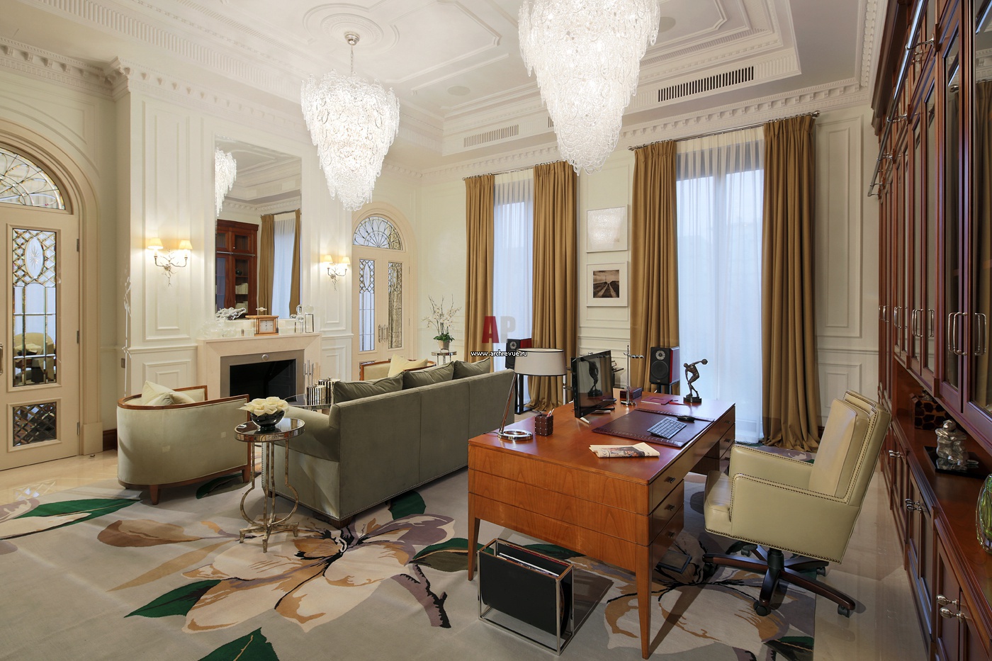 Кабинет хозяина дома в стиле ар-деко. Двустворчатые двери отделяют помещение от примыкающей к нему столовой. Также в эту комнату ведет еще один вход из коридора.
