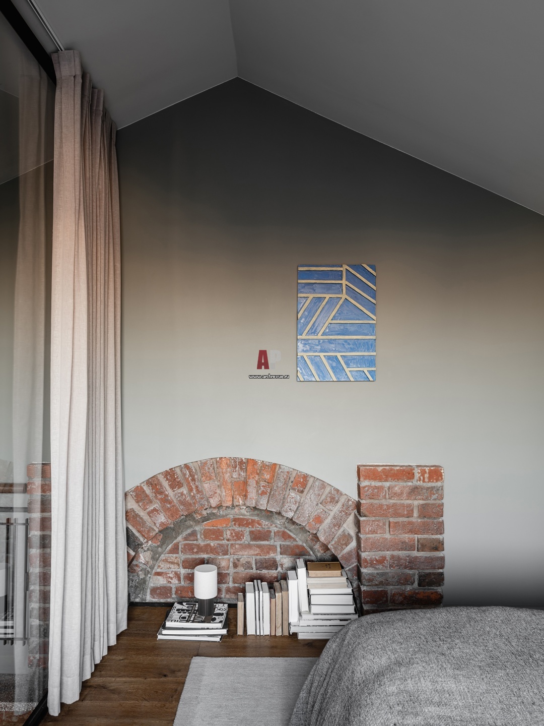 Украшение современной спальни – выразительная деталь старого кирпичного свода. На стене – рельеф Игоря Шелковского.
